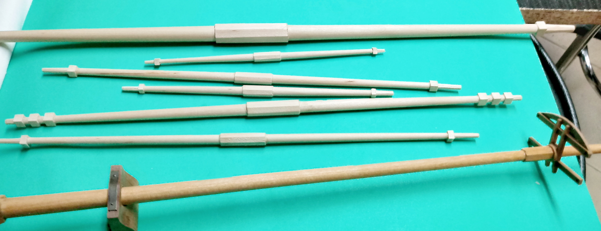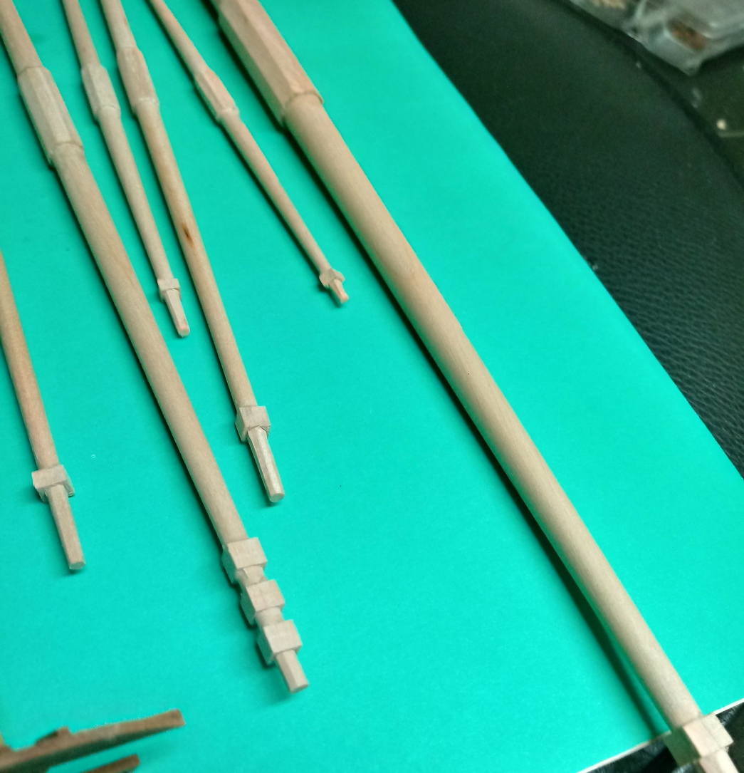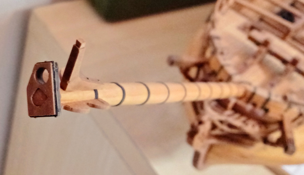 Na tym zdjęciu widać olejowaną stengę grota. Od razu rzuca się w oczy różnica koloru między masztem, a rejami. Niestety nie zadbałem o odpowiedni zapas olchy o jednym odcieniu i reje muszę jakoś zabarwić, aby nie różniły się zbytnio od masztów. :|