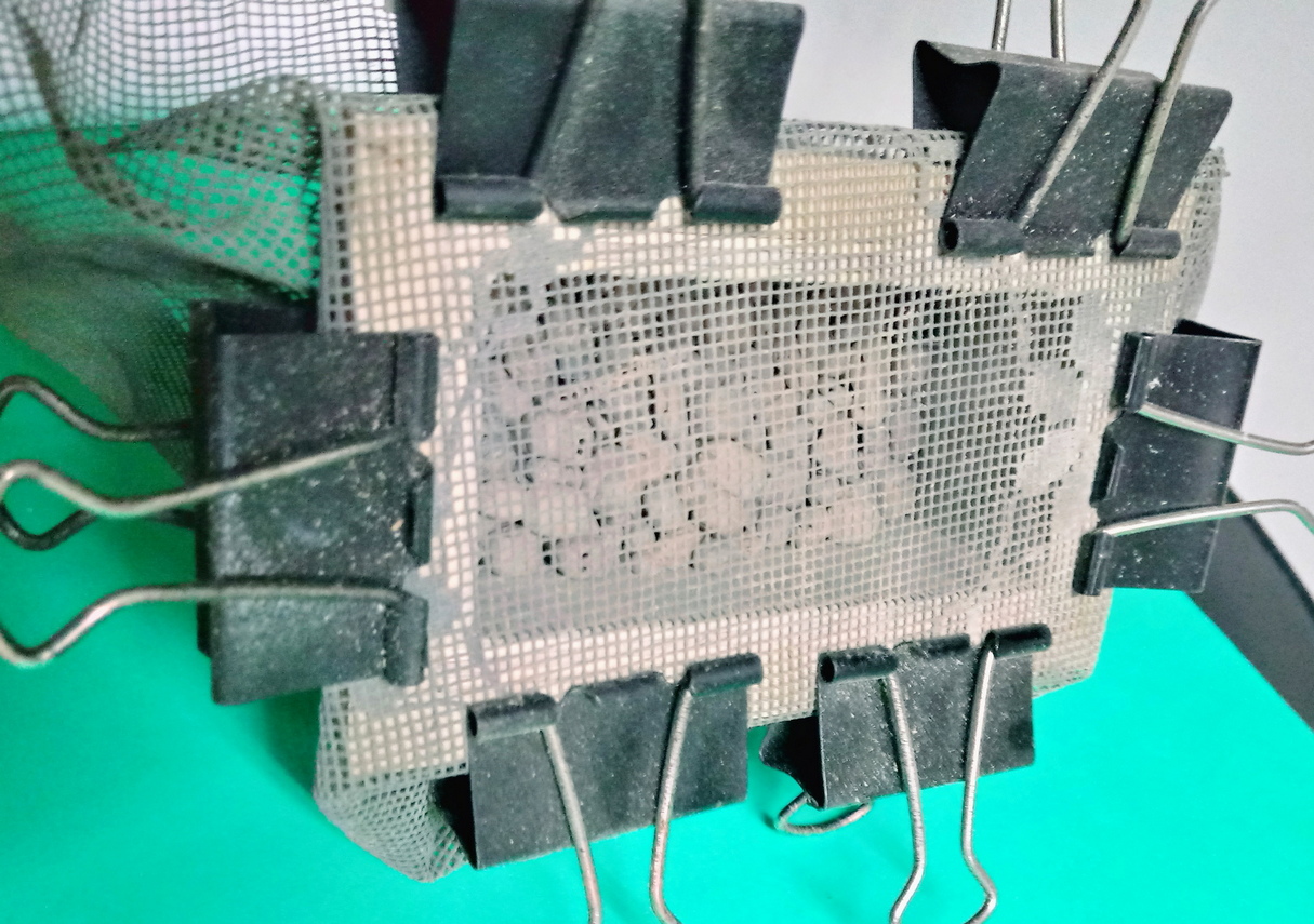 Siatka ze starej firanki posłużyła jako filtr do odkurzania skrzynki: