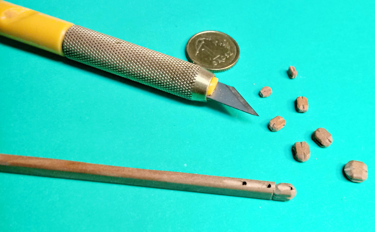 Listewka o wymiarach przekroju danego bloczka, otwory na frezarce, reszta obróbki to już niemal tylko nożyk:
