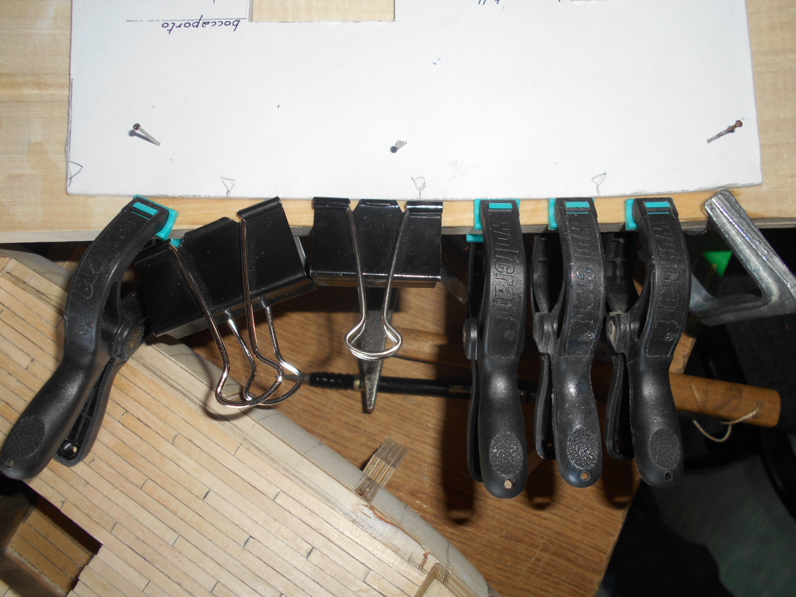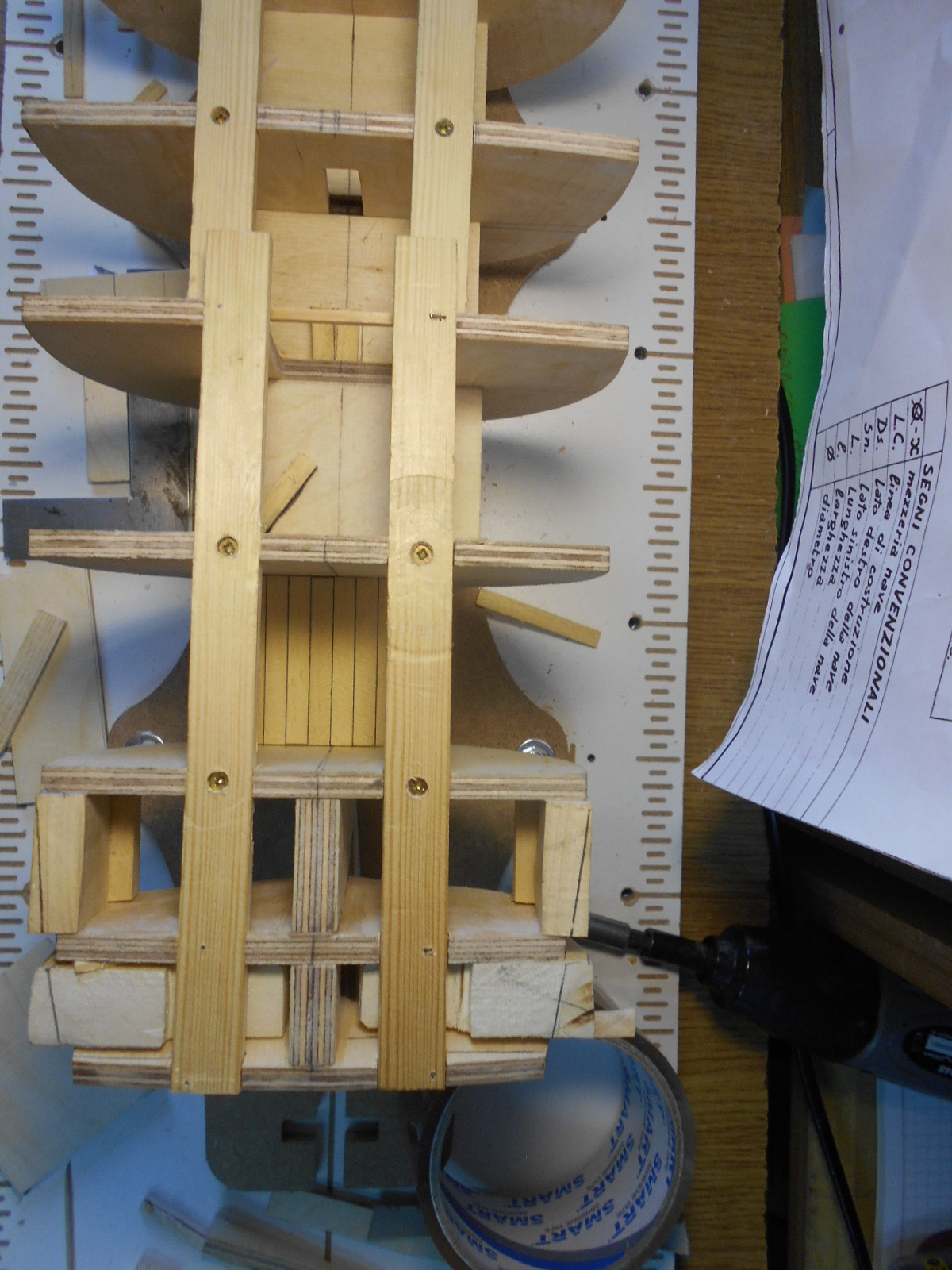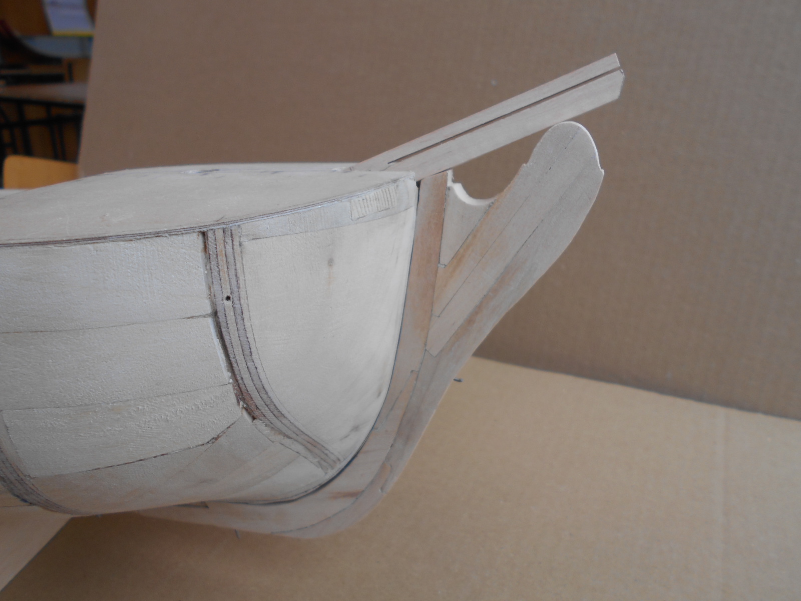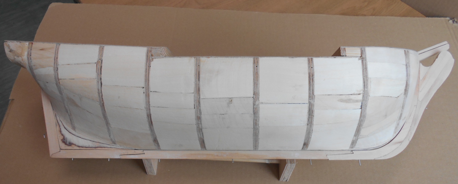 Wewnętrzne pokłady i ścianki w końcu zrobiłem. zacząłem powoli obklejać kadłub drewnem brzozowym.