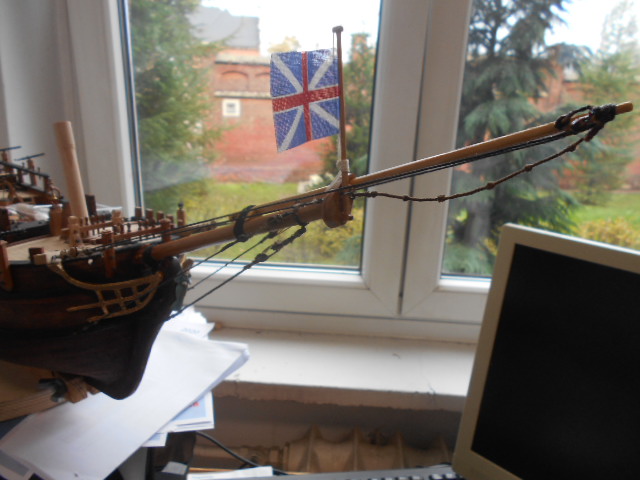 jeszcze po drodze wykonałem maszcik flagowy z wyciętej listewki z debiny , co bu sie za szybko nie połamał.