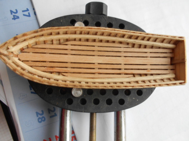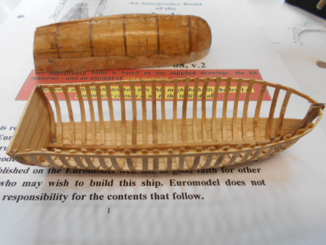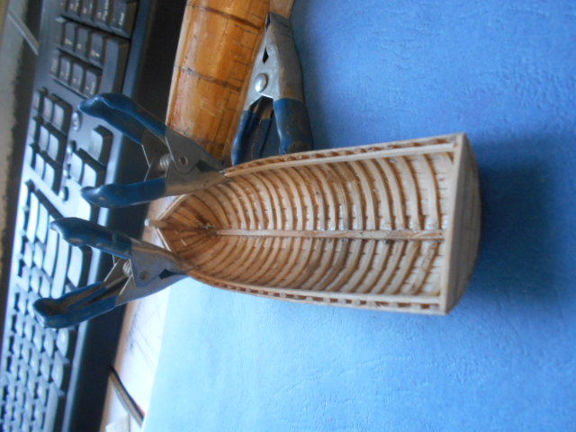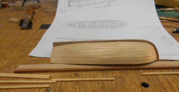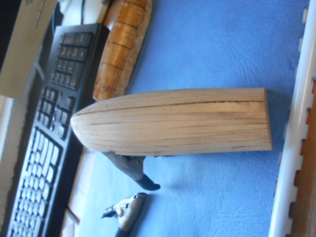 Udało mi sie w końcu skończyć poszycie szalupy i przy okazji zrobiłem "pojemniki" na kulki do armat. Kulki maja średnicę 3mm. Szalupa obcięta już na wymiar i pozostało ją wyposażyć w stępkę i to co w jej wnętrzu.