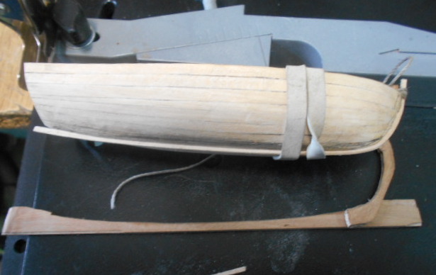 Wkleiłem cienką listewkę z olchy w szparę, którą zostawiłem w poszyciu dna i dziobu. W listewce gruszy wyfrezowałem kanalik i tak powstał mi kil. Nałożyłem go na dno i oszlifowałem na wymiar.