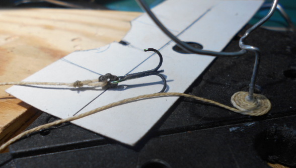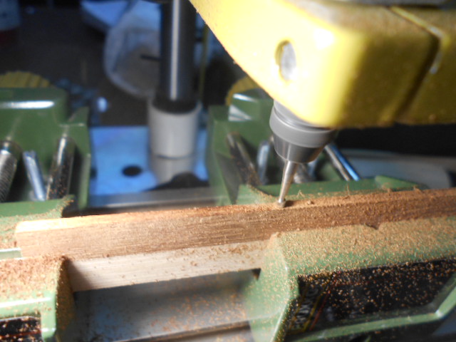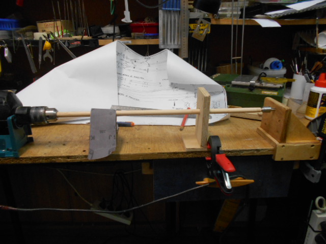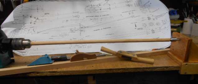 płótnem lnianym ( kiedyś zrobiłem z niego żagle na plastikowy model MYFLOWER) wykleiłym podstawki Przy okazji zaopatrzyłem szalupę w kotwice. Jednak sie tu nie mogę chwalić bo sama kotwica to Gamakatsu No i już na pokładzie] Zabrałem się w końcu za "patyki " . Otrzymałem od Mirka materiał na maszty, kwadratowe listwy z olchy. Najpierw jw strugami robionymi własnoręcznie przez Mariana (CUDEŃKA!!!) z kwadratów zrobiłem okrąglaki .Zostało tylko oszlifowanie. Tokarka okazała sie za krótka ( 45cm patyk) więc z wiertarki i sklejki taki przyrząd do oszlifowania masztów.