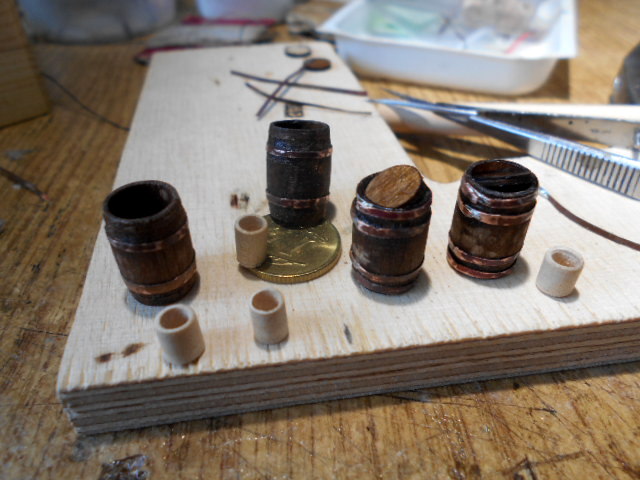 Żagiel z masztami do szalupy i kilka beczek (zdjęcia w czasie prac) Teraz czas na żagle. Żagle będę robił z płótna lnianego białego na koszule Bryty na żaglach będę robił poprzez przeciąganie obcej nici przez usunięte nici płótna.