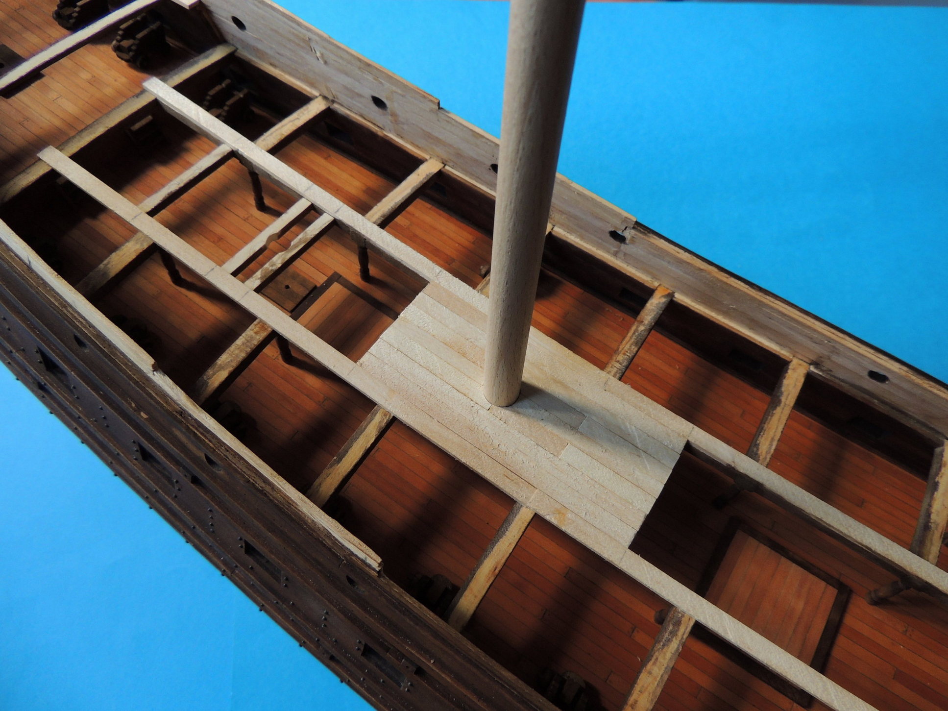 Wywierciłem otwory na drzwi do bocznych galeryjek, po czym przeskoczyłem na dziób, i dokleiłem brakujące elementy stewy.