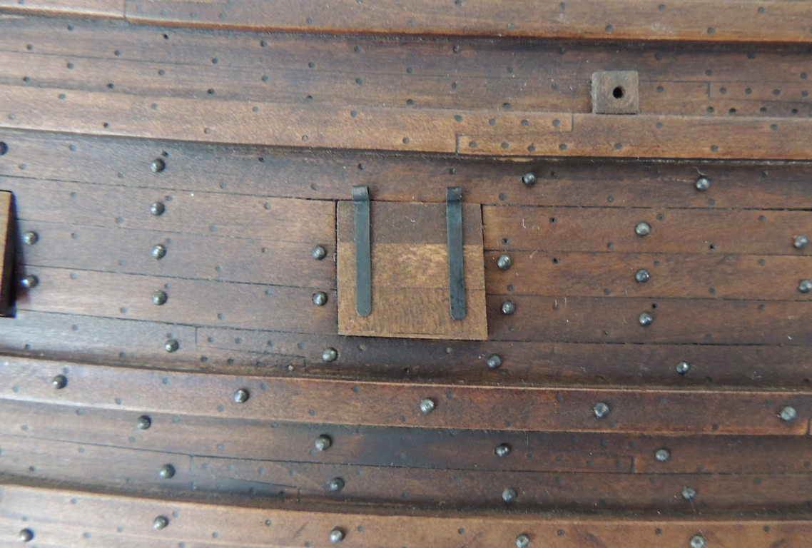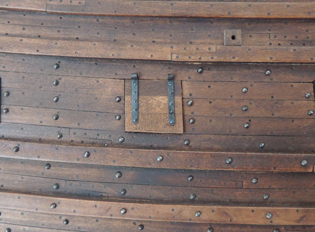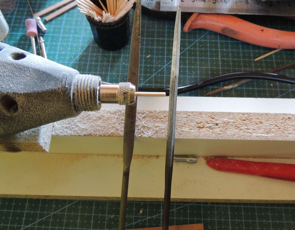 Struganie nagli poszło całkiem sprawnie. Użyłem wykałaczek. Mocowałem je w szlifierce i frezowałem iglakami. Kołkownice (nagielbanki) zamocowane do burt.
