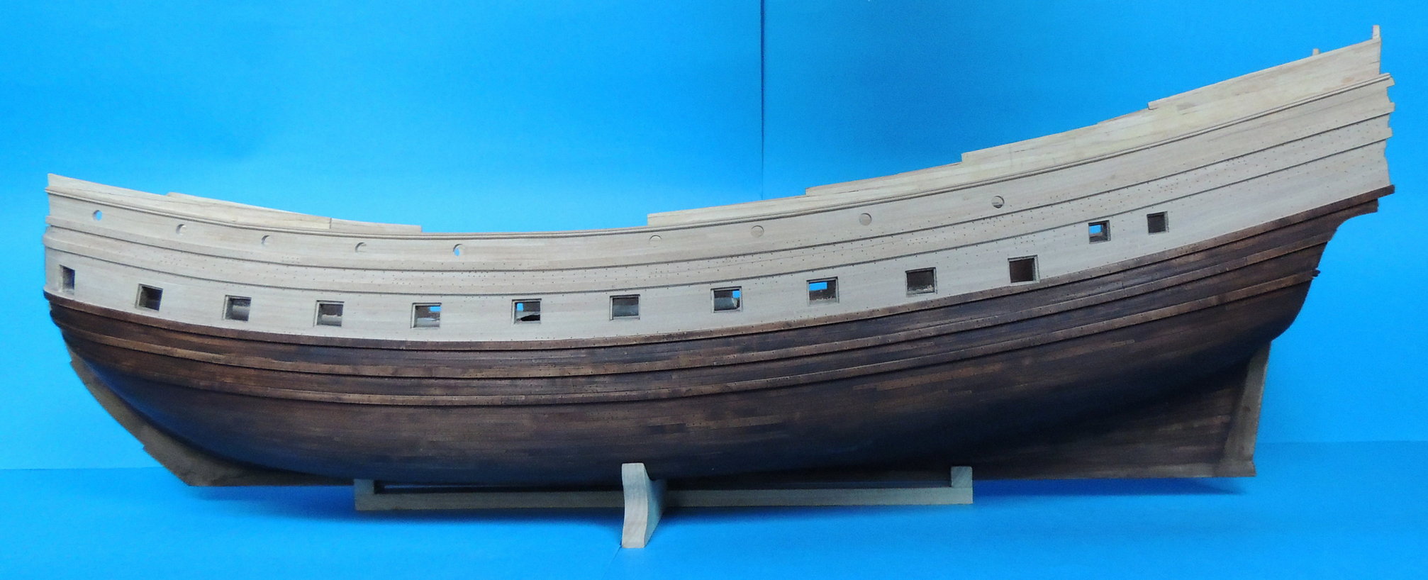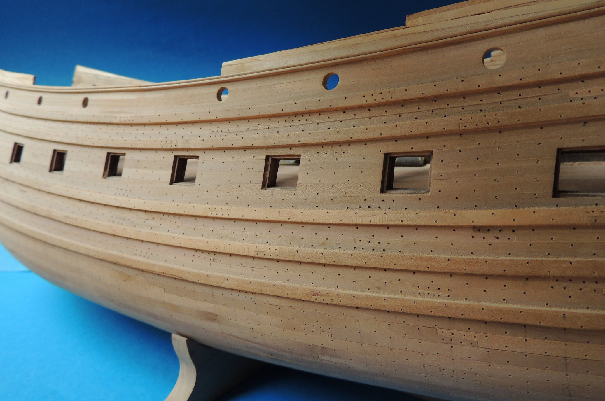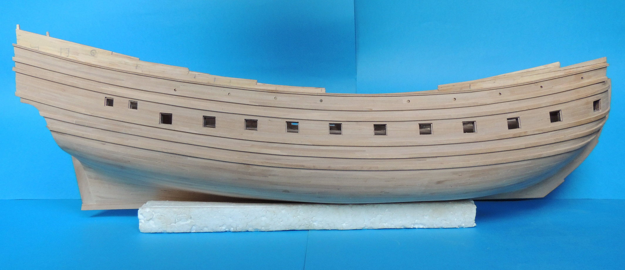 Odbojnice przyklejone. Wywierciłem otwory pod kluzy kotwiczne, i wstępne otwory ambrazur górnego pokładu. Jako że model nabrał już kształtów, zacząłem strugać dla niego podstawkę z prawdziwego zdarzenia