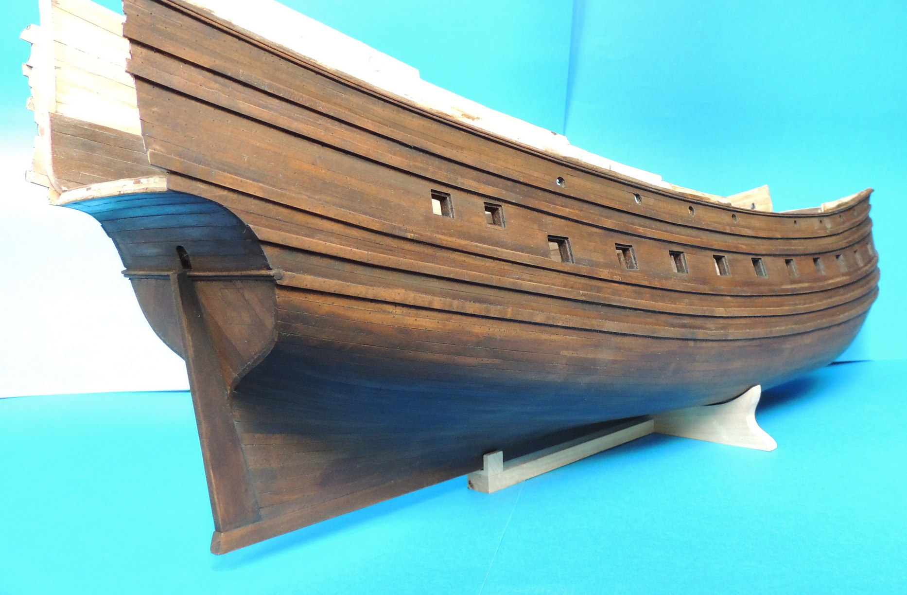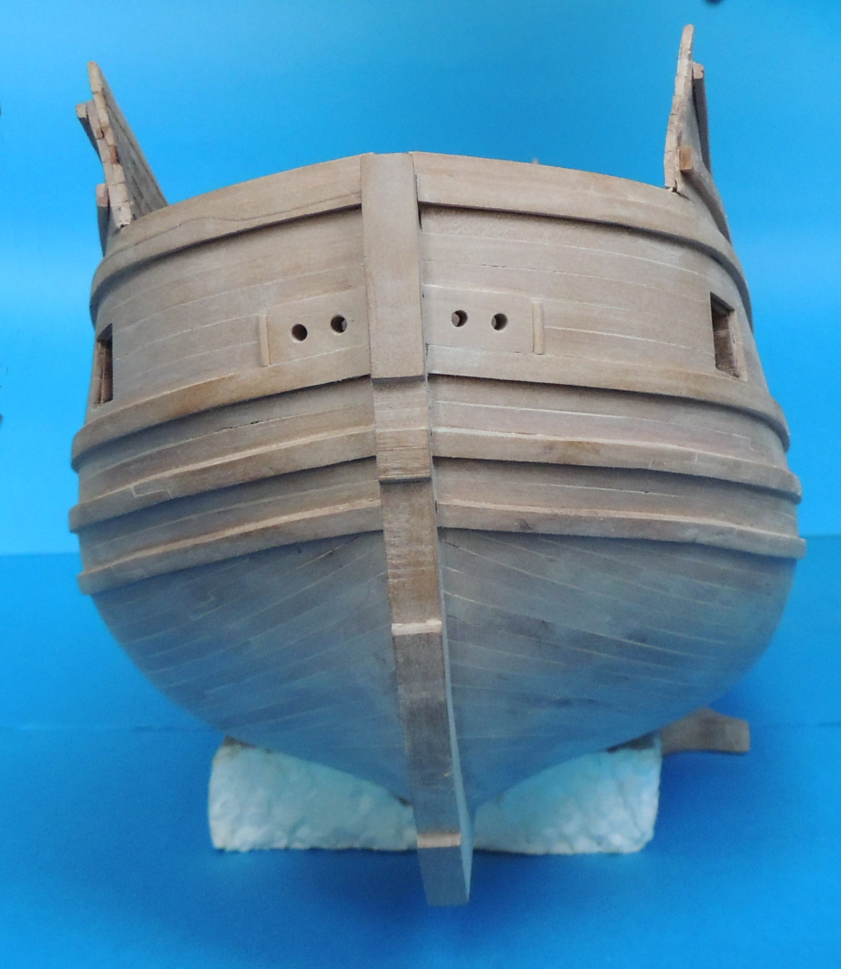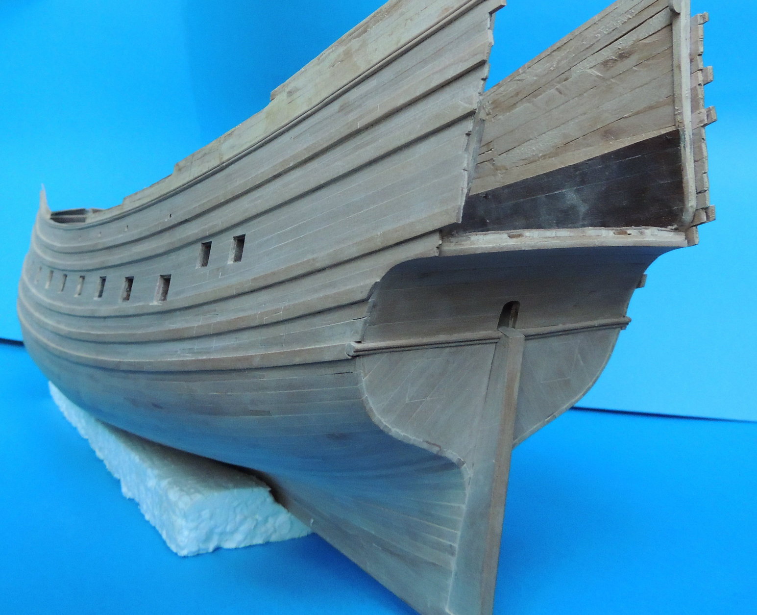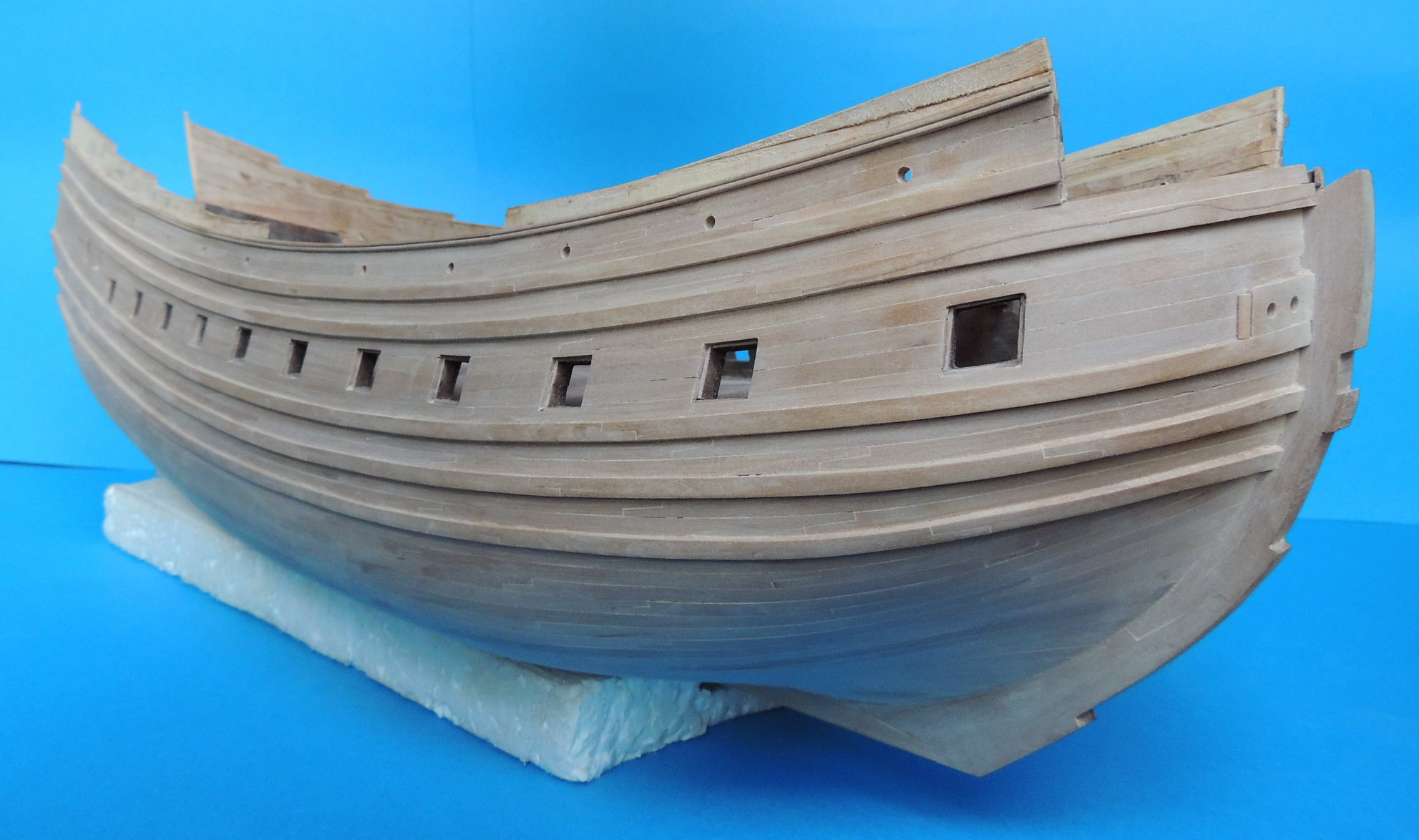 Odbojnice przyklejone. Wywierciłem otwory pod kluzy kotwiczne, i wstępne otwory ambrazur górnego pokładu. Jako że model nabrał już kształtów, zacząłem strugać dla niego podstawkę z prawdziwego zdarzenia