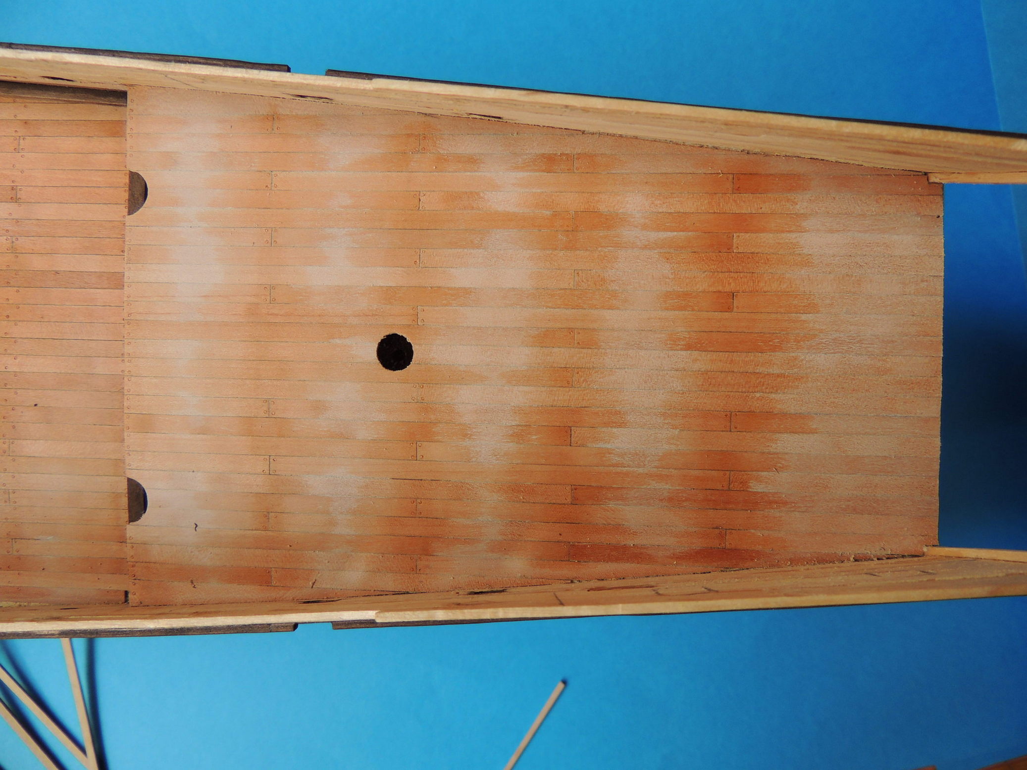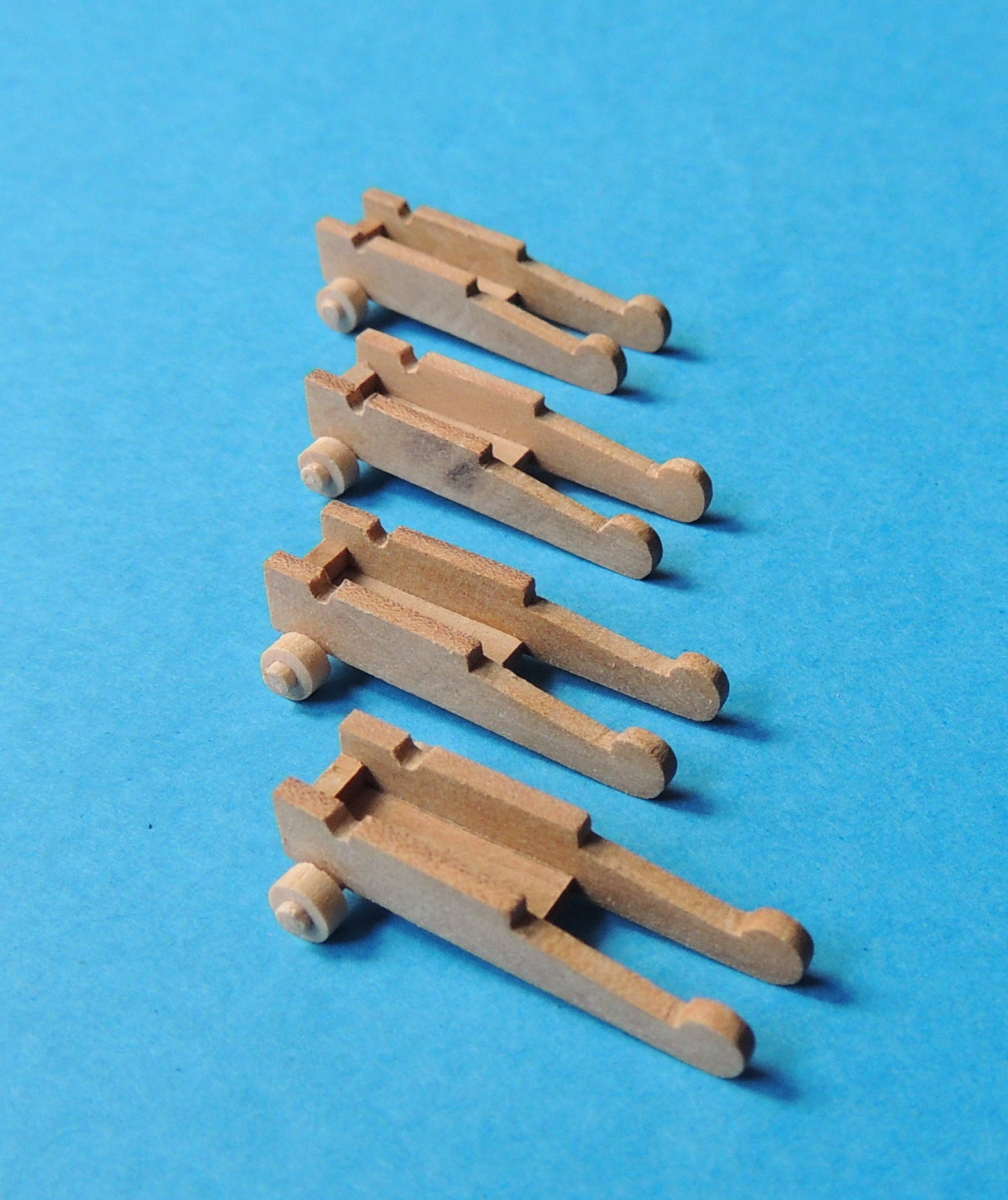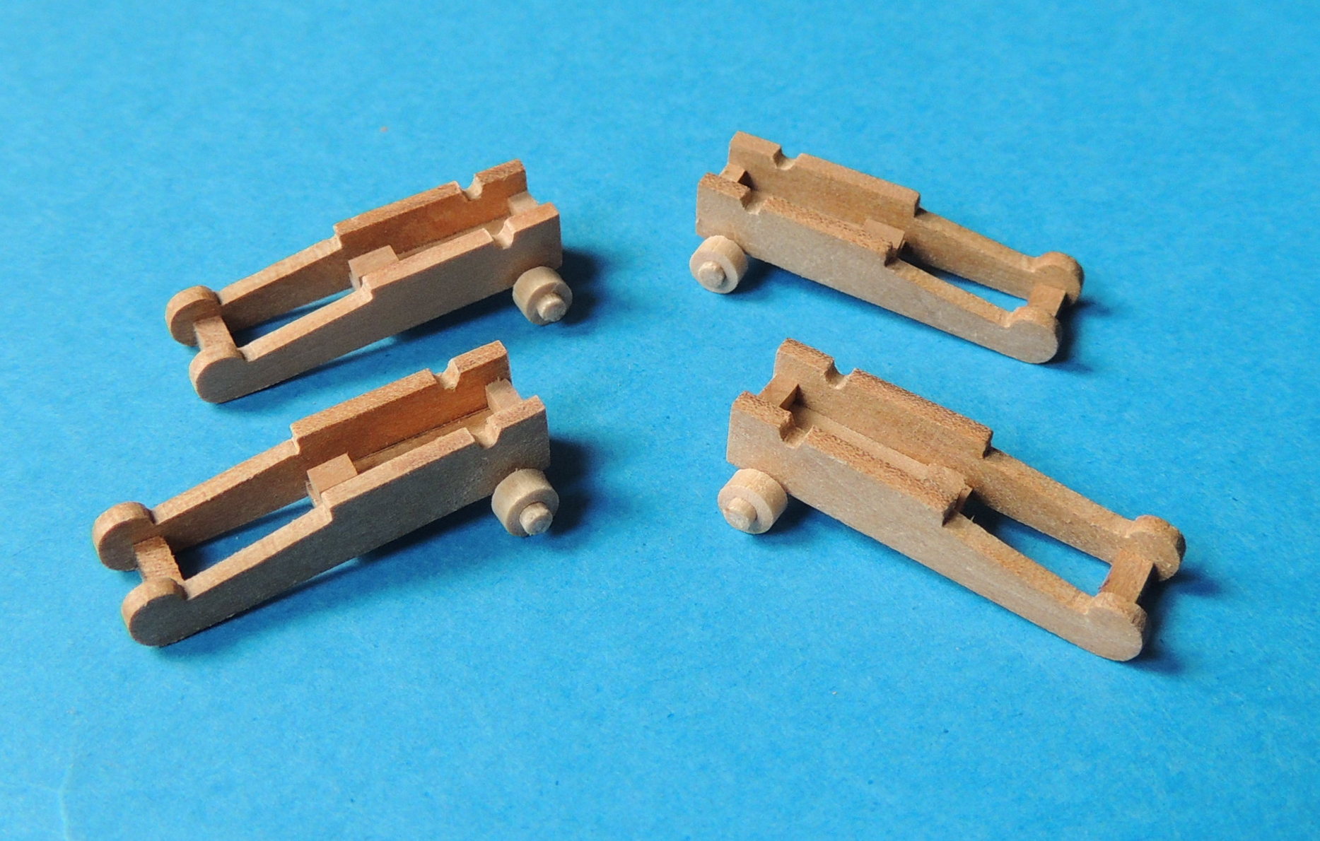 Cześć. Powstały kolejne cztery lawety, według rysunku z książki. Pokładzik jest niski, więc stwierdziłem, że właśnie na nim powinny być tego typu lawety. Na koniec wszystko przykryłem kolejnym fałszywym pokładem.