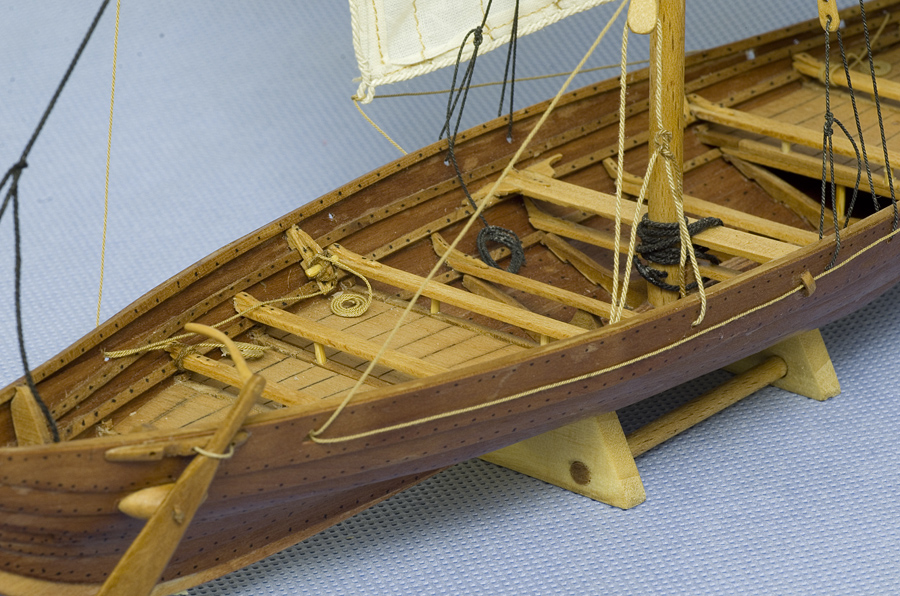 Kolega pytał o imitację kołkowania. Otóż nie jest to imitacja kołkowania ale nitowania :D . Łodzie wikingów były doskonałe, ale łodzie słowian także były doskonałe. Po prostu jedne miały lepsze to, drugie tamto. I właśnie łodzie słowian biły łodzie wikingów sposobem łączenia poszycia - były kołkowane, natomiast łodzie wikingów były nitowane żelaznymi nitami, a te korodowały. Jak zrobiłem nitowanie? Ano poszycie jest z forniru 0,6 mm, co daje 1,2 mm na łączeniu. Nie ma szans (przynajmniej ja nie potrafię) nawiercić i coś wstawić - nie kołki, bo to musi imitować żelazo. Początkowo chciałem zastosować sposób RomkaS z kropelkami kleju zabarwionymi na czarno, ale niestety, mimo kombinowania i sprawdzania różnych sposobów nakładania kropelek kleju, nie udało mi się uzyskać powtarzalnego efektu, kleksy były różnej średnicy. Więc w końcu zrobiłem to najprostszym z możliwych sposobów: Faber Castel 0,2 mm i punkciki są rysowane/malowane :D