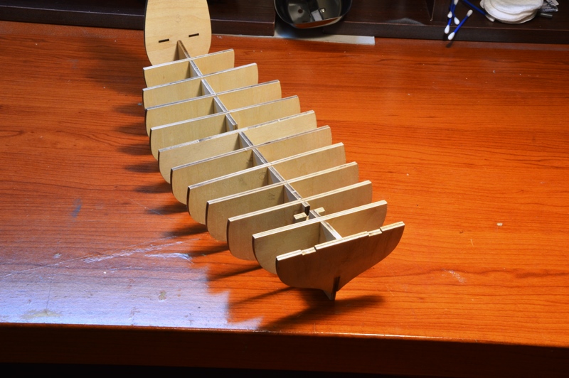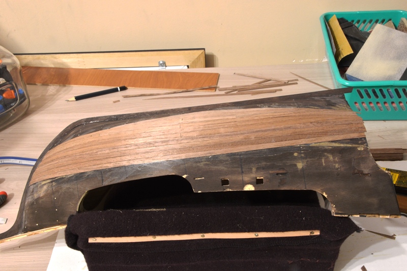 Główny pokład wklejony na wręgi oraz po obu stronach nadburcia, które okleiłem po wewnętrznych stronach fornirem z orzecha / nie wiem czy włoskiego, czy afrykańskieo/ :|
