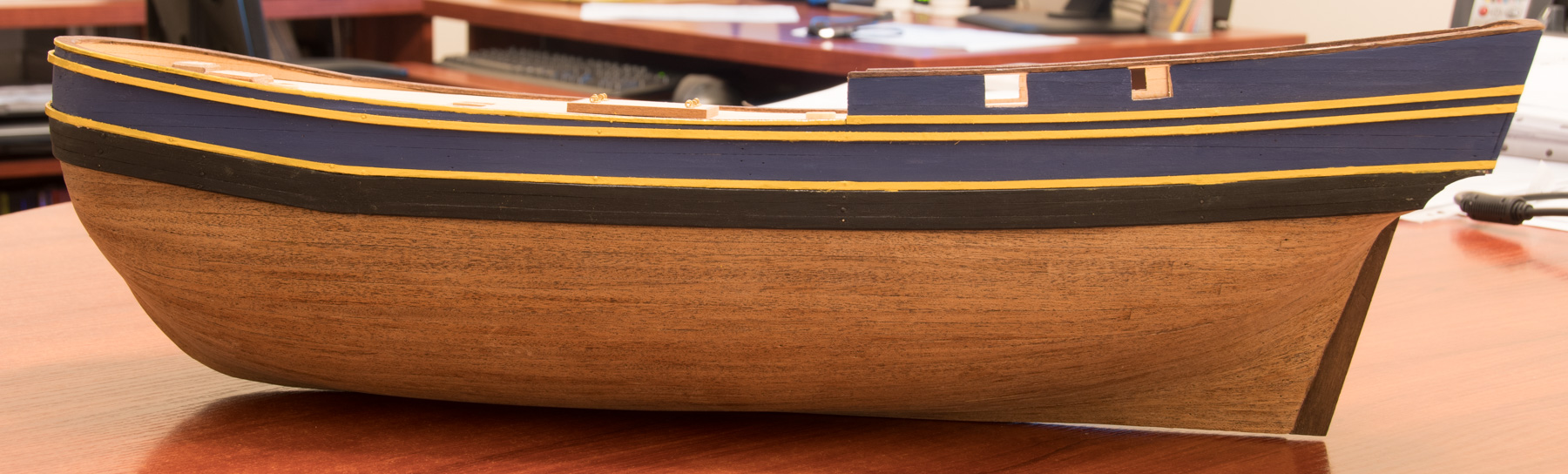 Oczywiście nie uniknąłem błędów i wyszło jak widać. Teraz schnie po malowaniu górnej części burty. Zrobi się drobne korekty i będzie git.
