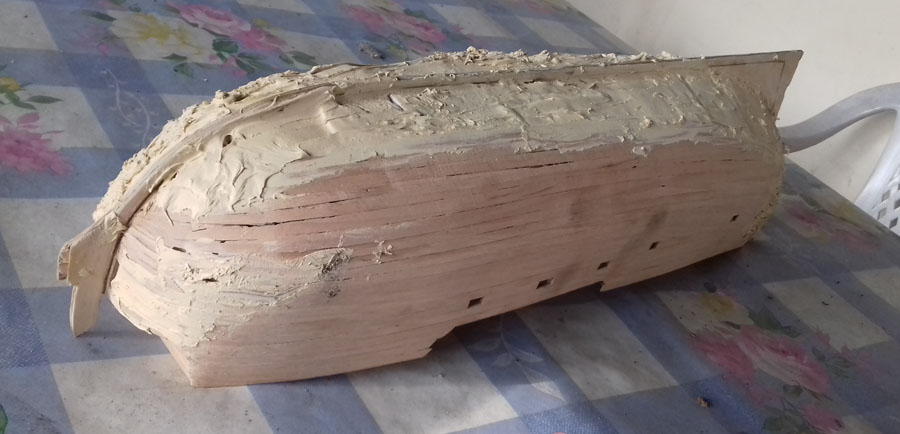 I tu wyszła następna kucha -cały kadłub zapiankowałem, a nie dałem twardych wypełnień na rufie i dziobie. No i listewki zaczęły się układać nie tak jak powinny, kombinowałem, początkowo miałem nadzieję, że uda się to naprawić szlifowaniem, ale im większe obłości się zaczynały tym bardziej przekonywałem się, że nic z tego nie będzie. No i kadłub ze skopanym częściowym poszyciem poszedł do kąta. W międzyczasie kleiłem sobie małe łódeczki wczesnośredniowieczne… i dumałem, co zrobić z tym Lwem. Nasz kolega Myszor polecał swoje drewienka, skusiłem się, zamówiłem parę deseczek, czyli pierwszy krok, aby coś z tym fantem zrobić. W końcu, jadąc w sierpniu na urlop do mamy zabrałem deseczki, kadłub, narzędzia i postanowiłem podziałać. Ale, żeby nie było za łatwo, Żółty Lew znów dał mi się we znaki, przy cięciu listewek siadła krajzega. Okazało się, że pasek zębaty do wymiany. Na szczęście serwis Proxxona spod Wrocławia zareagował szybko i pasek miałem po dwóch dniach. Mając już listewki, zabrałem się za reanimację kadłuba. Ostro potraktowałem całość szlifierką, w części dziobowej ścierając niektóre listewki całkowicie, potem potraktowałem częściowo kadłub szpachlą.