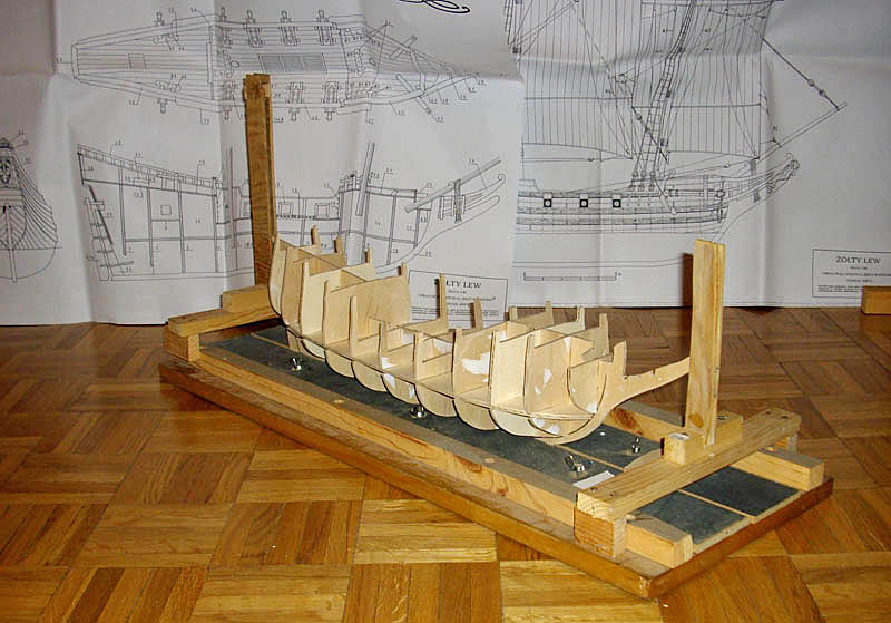 Ale wtedy jeszcze bawiłem się z Halconem, więc nowa budowa była tą drugoplanową, szkielet leżał w kącie, czekał na swoją kolej, ucierpiał też trochę w międzyczasie. Dopiero gdy skończyłem Halcona, postanowiłem na poważnie zabrać się za Żółtego Lwa. Najpierw zrobiłem pokład z froniru bodajże klonowego, na podkładzie z tekturki. No i dup… znaczy duża kucha, bo pokład samoistnie wygiął mi się końcami do góry, czyli odwrotnie niż powinien być ukształtowany. No to pod wodę onego i dalej formować na dużej butelce. Efekt był, za dobry, obłość pokładu we właściwą stronę, ale mocno za bardzo wygięty. Nie było rady, trza było robić pokład od nowa, tym razem na podkładze ze sklejki, bodajże 0,8 mm. Teraz zaraz po przyklejeniu pokład zamocowałem na szkielecie i mocno powiązałem, tasiemkami, gumkami, aby klej sechł już w odpowiednio ukształtowanym położeniu. No i tym razem się udało.