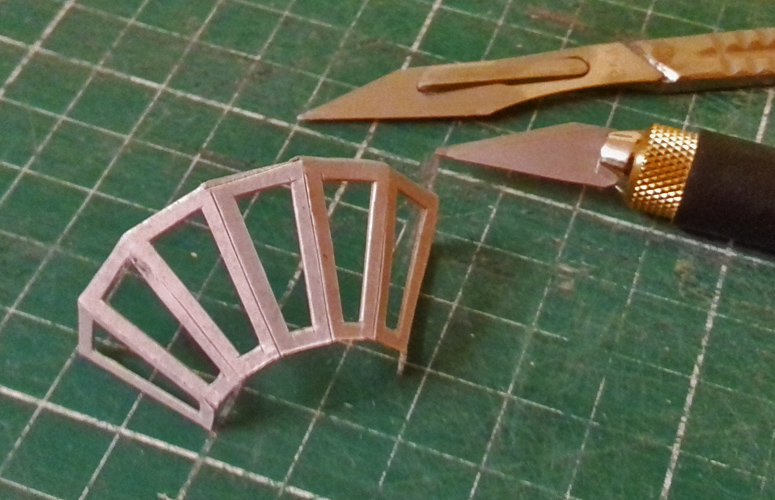 Szablony komputrowo przygotowane wg planów, wydrukowane na przylepnym papierze. Siatka latarni wycinana z cienkiego kartonu zaimpregnowanego lakierem. Po wycięciu szablon z samoprzylepnego usunięty. Siatka zagięta w sześciokąt, pomalowana akrylem Model Master Gun metal. Na wypełnienie okienek dałem stare rajstopy żony :D . Rozciągnięte na ramce, usztywnione lakierem. "Czapeczki" górna i dolna z drewna, górna zwieńczona łepkiem szpilki entomologicznej (czy jak tam ją zwą) też potraktowane Gun metalem
