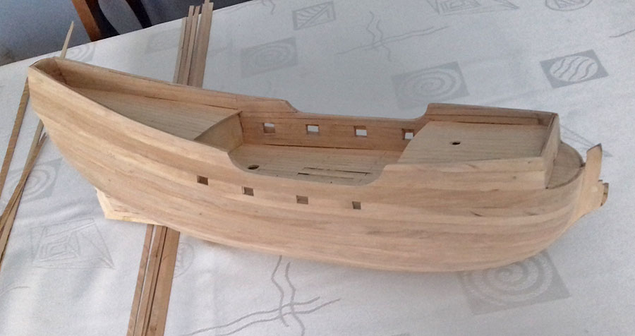 Pewnie i ta technika przyczyniła się do złego układania się poszycia, bo kontrola nad odpowiednim wygięciem była niewielka. Teraz zainwestowałem prawie stówę w zestaw do wyginania- lutownica z kolbą i krzywik. Jak ja mogłem do tej pory wyginać listewki nie mając takiej lutownicy??? Drugie poszycie już wyszło w miarę poprawnie, choć jakieś małe felery się i tak przytrafiły, coś tam nie tak ułożyło się przy pawęży.
