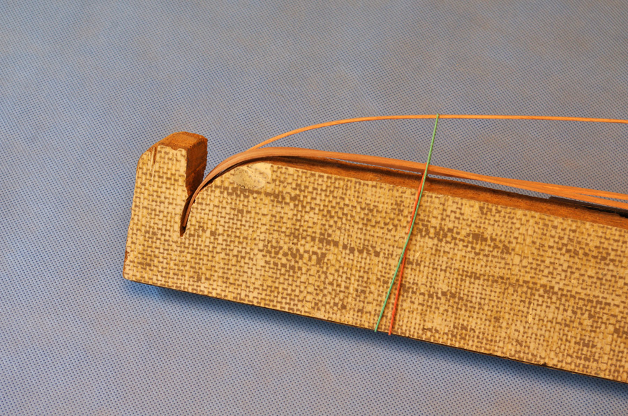 Po zaschnięciu kolejne szlifowanie i kadłub można było zacząć oklejać, powiedzmy, drugim poszyciem. Tym razem listewkami z gruszy, przygotowanymi z materiału od naszego kolegi Andrzeja – Myszora (świetny materiał). Za pierwszym razem gięcie listewek wykonywałem przy pomocy gotowania i potem suszenia w naciętej po łuku desce.