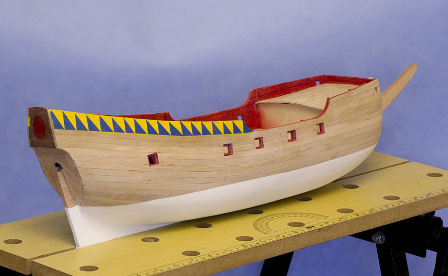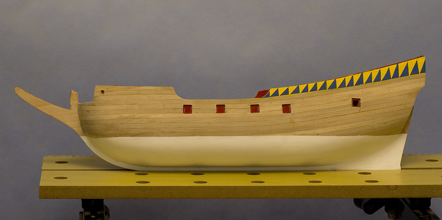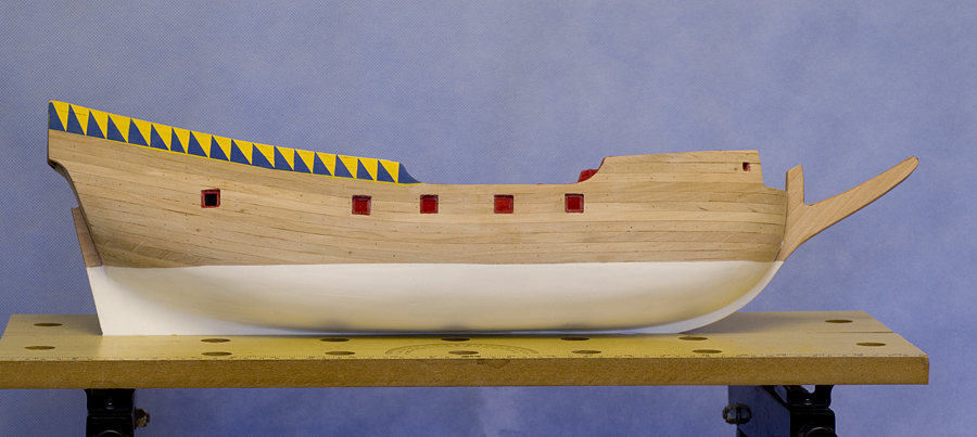 Do tej pory budując modeliki poprzestawałem na olejowaniu czy też pokostowaniu, kolorów nie nakładałem. Ale teraz stwierdziłem, że czas popróbować z farbkami. Była to moja pierwsza zabawa z aerografem... no próbowałem zanim psiknąłem na modela - na kartce papieru, ... ale trza jednak troszkę się oswoić z tym sprzętem. Powiem tylko, że część poniżej linii wodnej malowałem dwukrotnie, za pierwszym razem było komplet nie do przyjęcia
