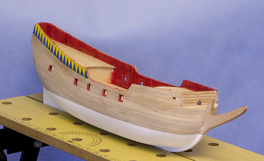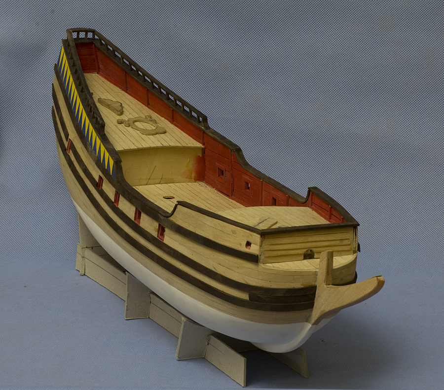 Ale wtedy jeszcze bawiłem się z Halconem, więc nowa budowa była tą drugoplanową, szkielet leżał w kącie, czekał na swoją kolej, ucierpiał też trochę w międzyczasie. Dopiero gdy skończyłem Halcona, postanowiłem na poważnie zabrać się za Żółtego Lwa. Najpierw zrobiłem pokład z froniru bodajże klonowego, na podkładzie z tekturki. No i dup… znaczy duża kucha, bo pokład samoistnie wygiął mi się końcami do góry, czyli odwrotnie niż powinien być ukształtowany. No to pod wodę onego i dalej formować na dużej butelce. Efekt był, za dobry, obłość pokładu we właściwą stronę, ale mocno za bardzo wygięty. Nie było rady, trza było robić pokład od nowa, tym razem na podkładze ze sklejki, bodajże 0,8 mm. Teraz zaraz po przyklejeniu pokład zamocowałem na szkielecie i mocno powiązałem, tasiemkami, gumkami, aby klej sechł już w odpowiednio ukształtowanym położeniu. No i tym razem się udało.
