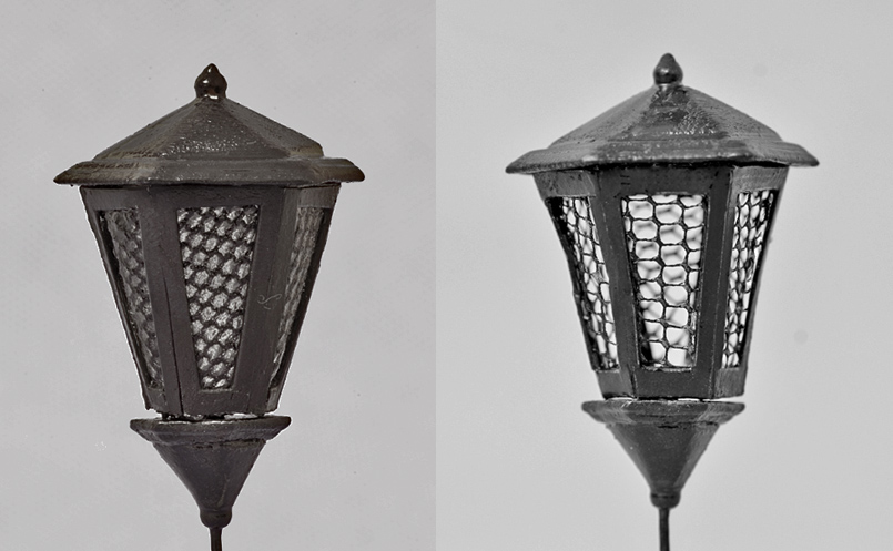 Szablony komputrowo przygotowane wg planów, wydrukowane na przylepnym papierze. Siatka latarni wycinana z cienkiego kartonu zaimpregnowanego lakierem. Po wycięciu szablon z samoprzylepnego usunięty. Siatka zagięta w sześciokąt, pomalowana akrylem Model Master Gun metal. Na wypełnienie okienek dałem stare rajstopy żony