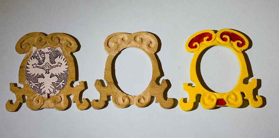 Dodłubałem trochę elementów na rufę. Jako, że to małe paskudztwa, trzeba trochę podłubać skalpelem, olfą i minifrezikami na wałku giętkim dremelka, a ja jeszcze niegramotny w te klocki, to trochę materiału zmarnowałem, zanim uznałem, że uwentualnie, od biedy takie już może być. Zwieńczenie rufy jest dwustronne, więc wzorek musiałem powtórzyć z obu stron. Na szczęście bordiura w którą będzie wpasowany orzeł jest tylko z jednej strony dłubana