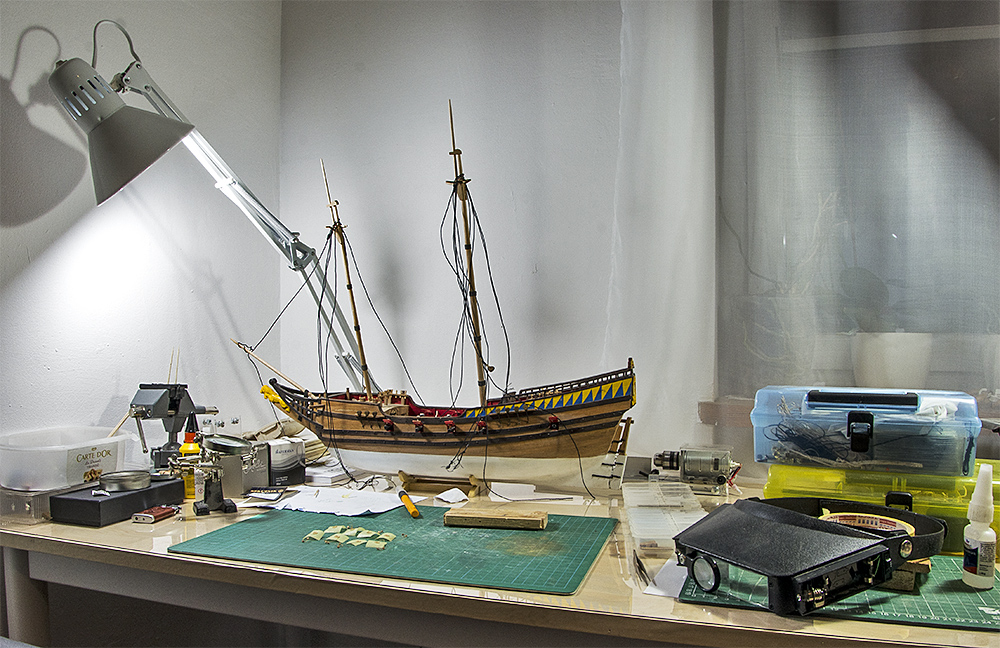 Od czasu do czasu wypada pokazać, co tam się podłubało Dotarły (z małymi pocztowymi "dowcipami") bloczki od kolegów ze Szkutnika i zabrałem się za dokończenie zestawu odciągów do lawet ( na jedną burtę starczyło mi jeszcze 2 mm bloczków Mirkowych, na drugą musiałem zamówić). Pozwijałem słoneczka, pozostało jeszcze doczepić haki i montować. A tak przy okazji: młodzież z domu się wyprowadziła czas jakiś temu... długo trwało, ale w końcu w zwolnionym pokoju zrobiłem sobie kącik dla siebie, z nieskromności wrzucam fotkę mojej gemyli