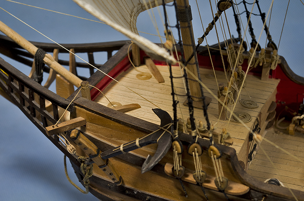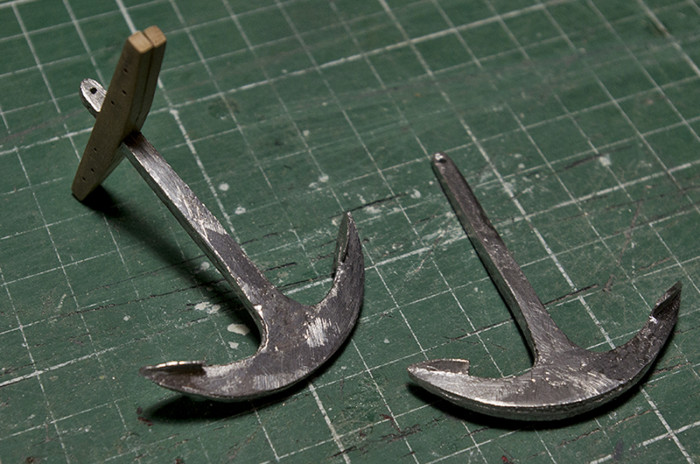 Drugi żagiel powieszony, przyszedł czas na kotwice. Zamierzałem wyciąć drewniane i pomalować jakimś gun metal Tamiji czy innej Pactry. Ale w międzyczasie rozmawiałem z koleżanką, napomknąłem, że czas na kotwice, a ona spytała: "będziesz odlewał?" ... No i tym pytaniem namówiła mnie do trochę trudniejszej zabawy. Pewnie drewniane byłyby bardziej idealnie gładkie, ale te są przynajmniej jak prawdziwe - metalowe