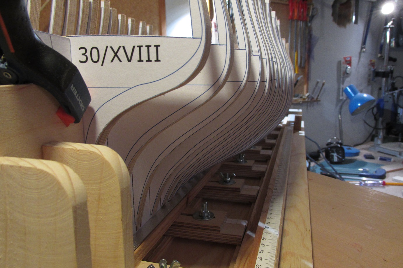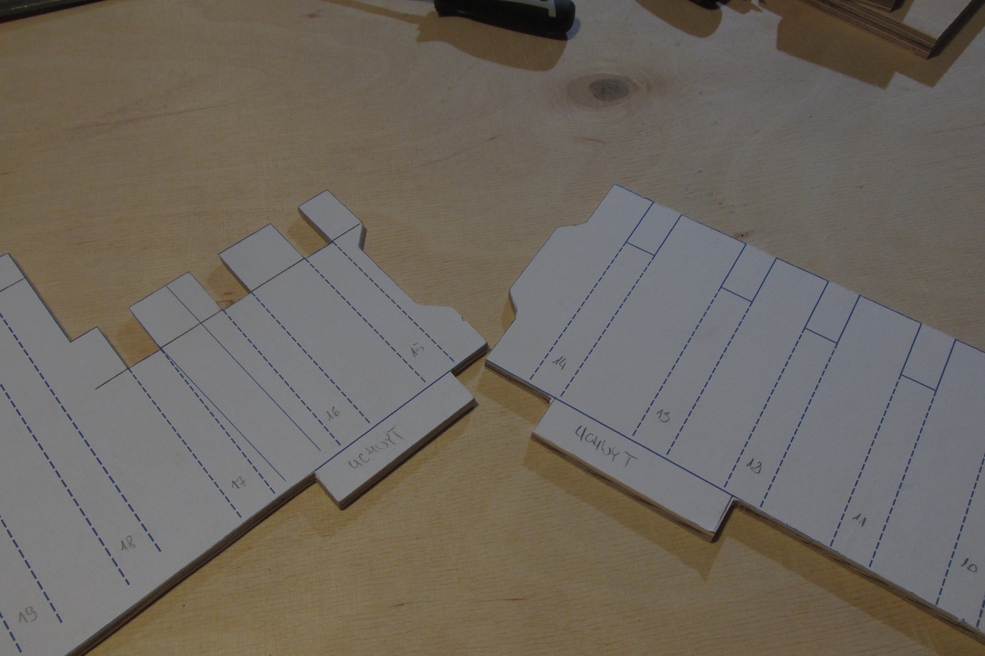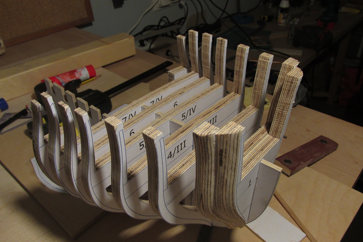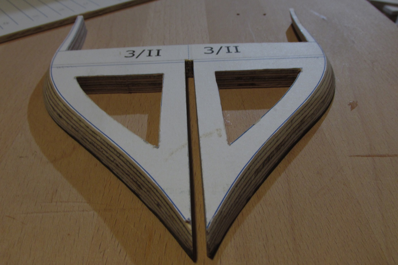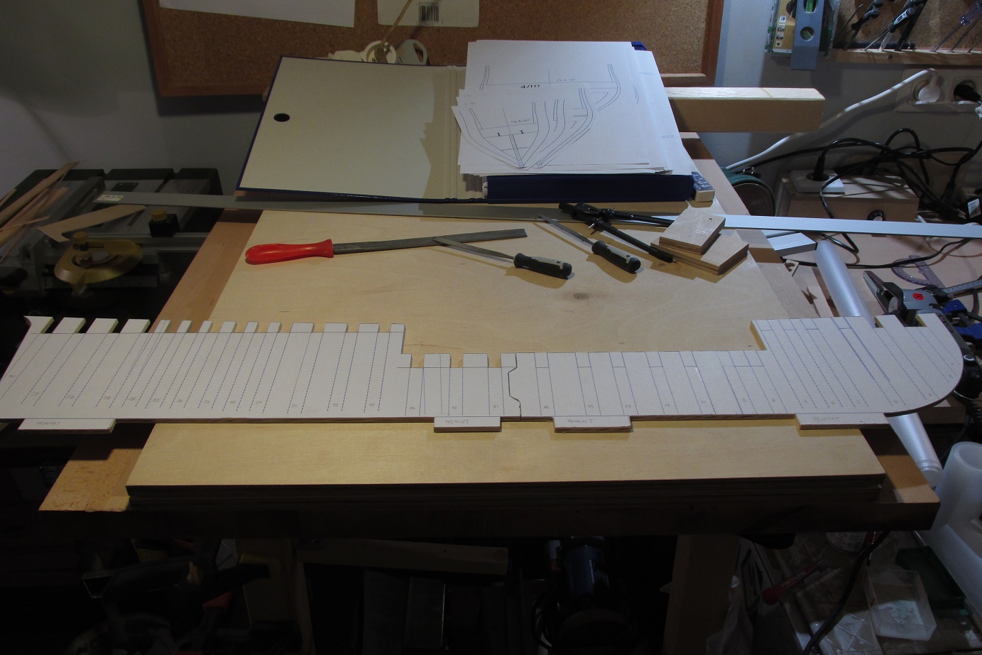Dzięki za miłe słowa Przemek. Tomku, wewnętrzne krawędzie grodzi będą zeskosowane, tak jak opisujesz to w swoim opracowaniu, będę zostawiał jeszcze nadmiar aby można było dokładnie doszlifować po sklejeniu szkieletu. Tego skosowania jest sporo i jeszcze wszystko trzeba dopasować, zanim zacznę sklejać to trochę jeszcze czasu upłynie. Póki co skończyłem wycinanie i na sucho przymierzyłem grodzie do stępki. Wyłonił się kształt kadłuba, będzie niezłe bydle :-)