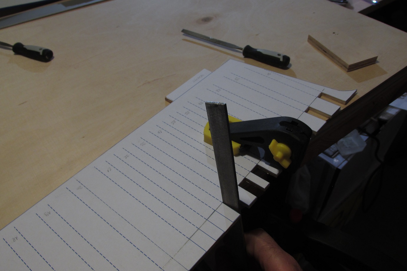 Każdą wyciętą przestrzeń pod grodź dopasowuję pilnikiem, tak aby 10mm grodź wchodziła dość ciasno.