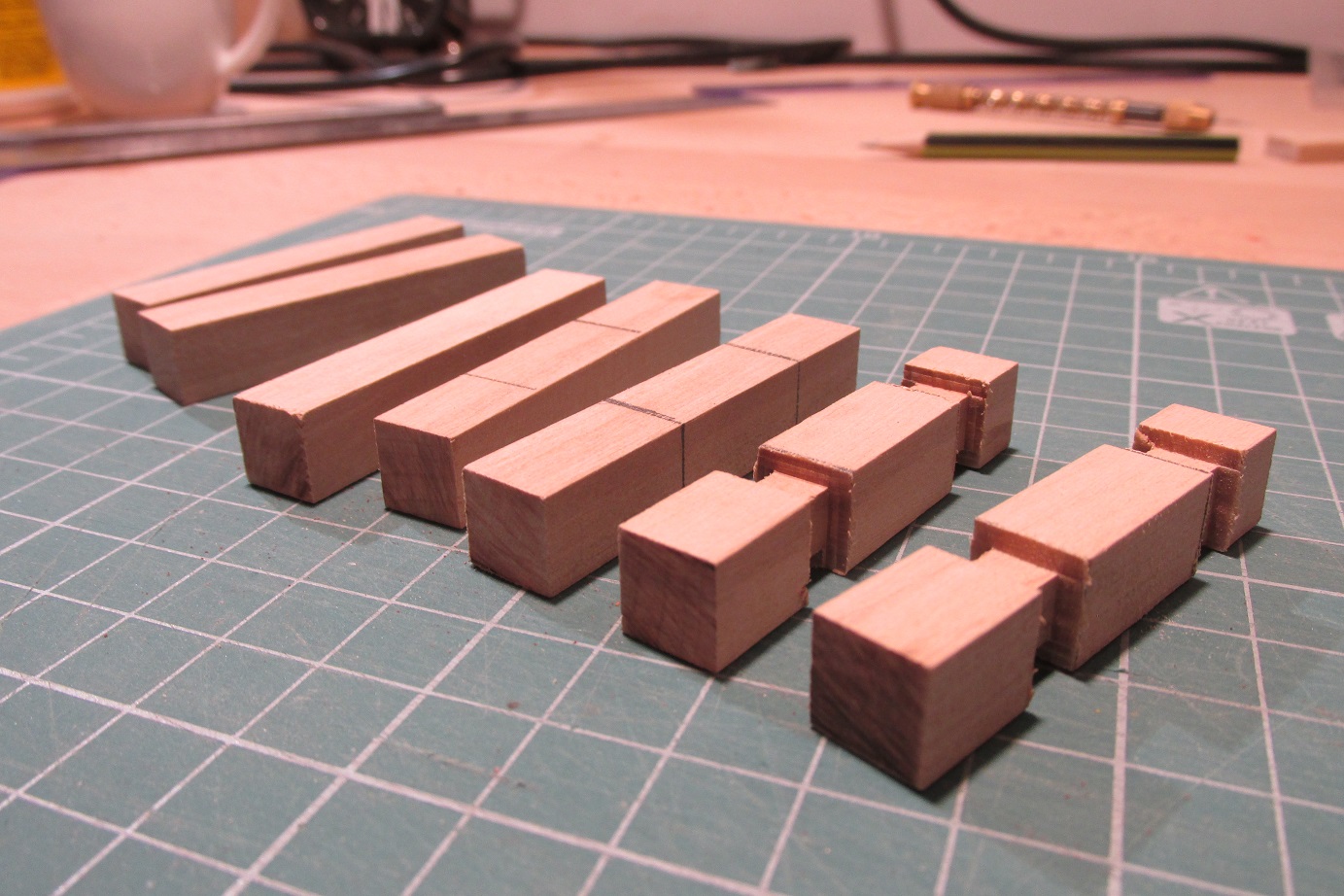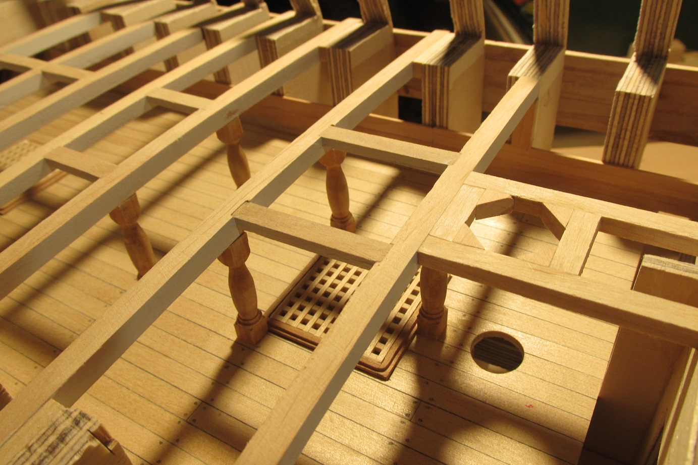 Ponieważ pod otwartymi gertingami pokładu górnego jednak coś będzie widać to postanowiłem zrobić kilka kolumn podpierających pokładniki. Mało widoczne elementy to dobra okazja do ćwiczeń :-)