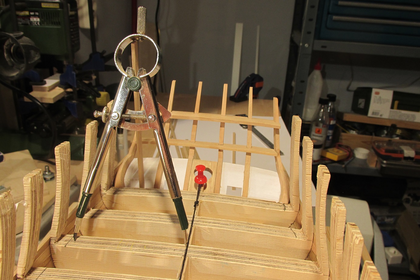 Zamontowałem waterway, no i teraz trzeba jakoś wyznaczyć furty działowe. Jak pisze autorytet, ich parapety są równoległe do pokładu: