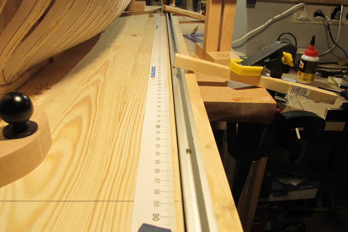 Widok wewnętrzny burty (bo taki mam też w planach) pokazuje że odległość od dolnej płaszczyzny pokładu do dolnego parapetu furty to około 10 mm. Listwa waterway-a ma 4 mm wysokości, dodając więc nad nią kolejną listwę 6 mm powinienem dostać żądaną wysokość. Przed montażem mam zamiar zwalidowwać tę wysokość uzyskaną od wewnątrz, wymiarem zewnętrznym zdjętym z planów. Nie wiem jak inni do tego podchodzą, bo niewielu się tym chwali :-), ale ja próbuję sobie rodzić tak jak na poniższych zdjęciach. Jak widać walidacja na jednej z furt wypadła pozytywnie :-)