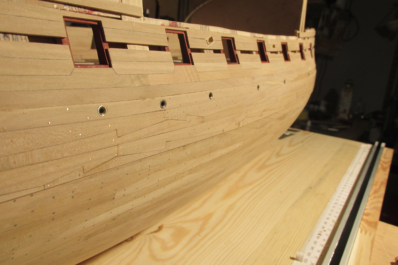 Wszystko powoli zmierza do malowania, jeszcze tylko kołkowanie burt w okolicach furt działowych oklejenie taśmą i malowanie. W części dennej wbiłem ponad 5000 kołków drewnianych, na odbojnicach kołki z drutu miedzianego fi 0,5 mm.