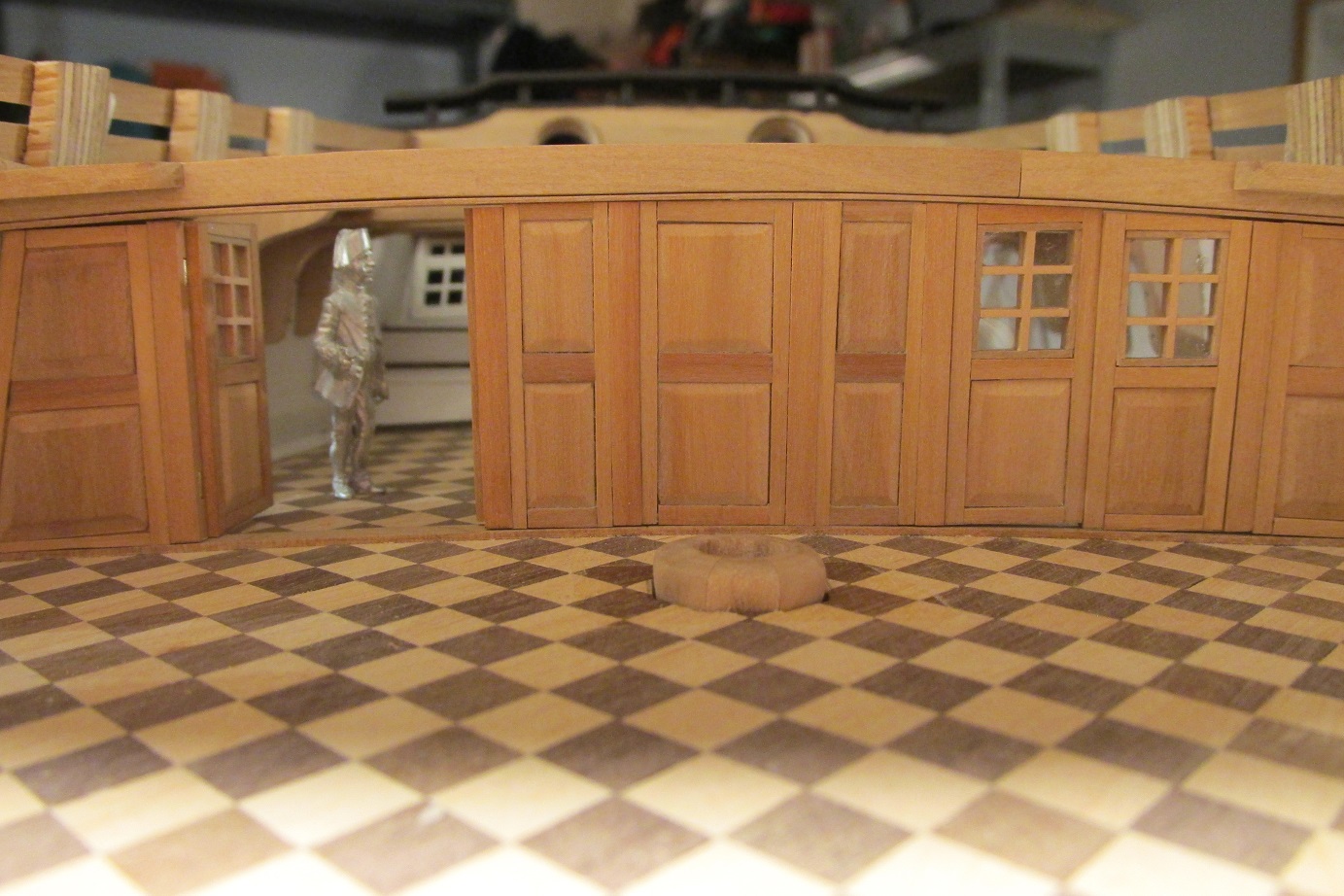 Dalej ciągnę ściankę pod quarter deckiem, ponieważ tokarka wróciła już z serwisu, to mogłem wytoczyć zawiasy do drzwi i je zamontować.
