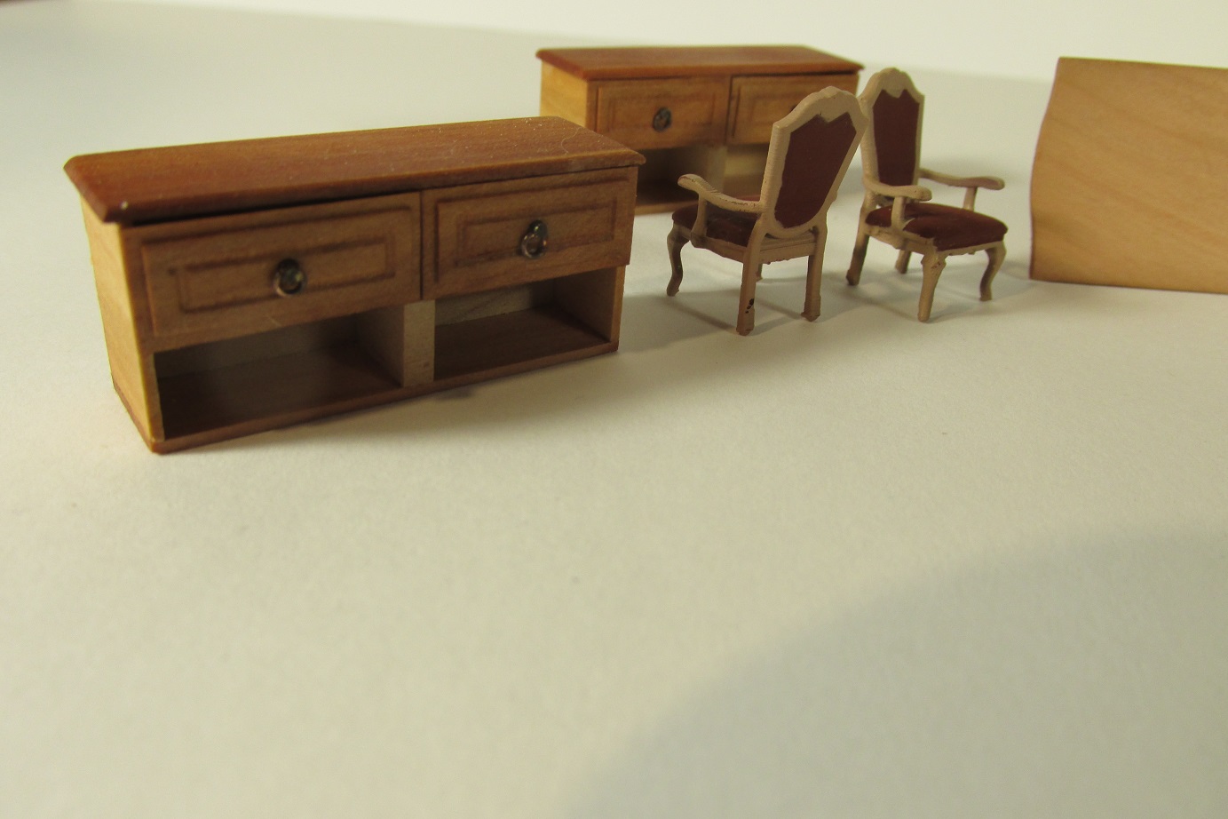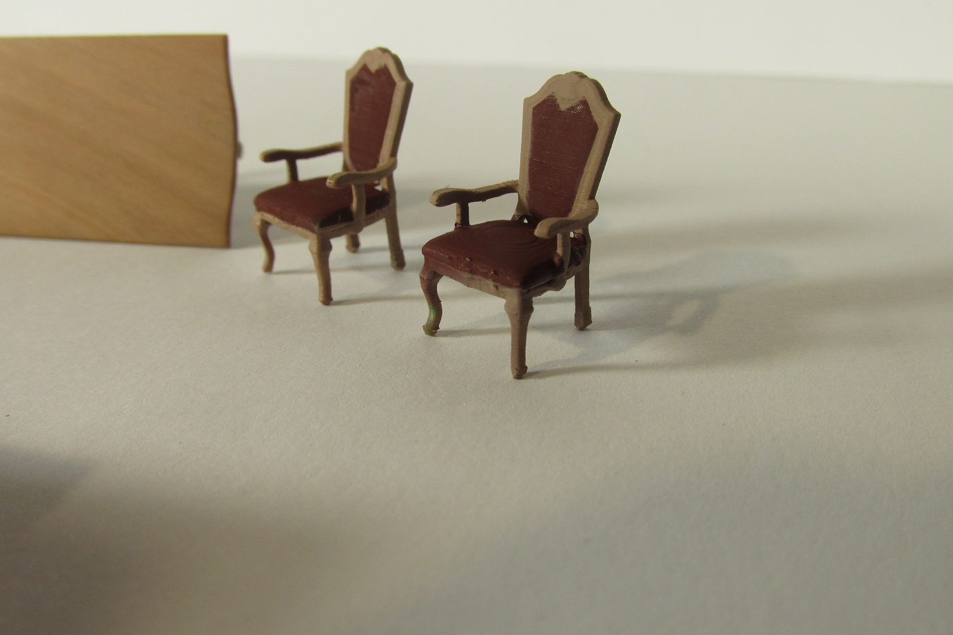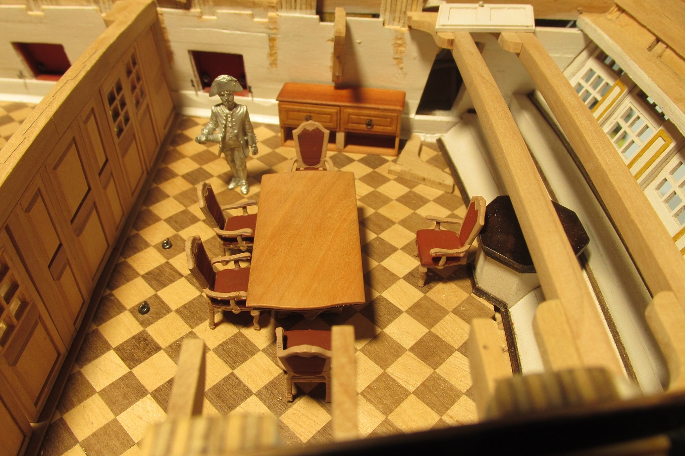 Budowa idzie dalej. Skończyłem montaż pokładników pod forecastle i zabrałem się przygotowanie montażu pokładników pod quarter deck. Najpierw muszę wyposażyć kapitański pokój. Dziś malowałem fotele, wczoraj wykonałem meble.