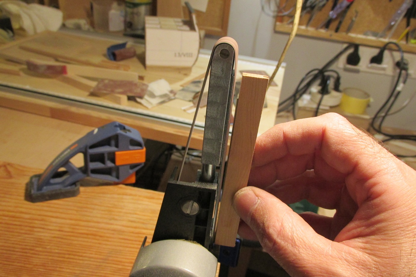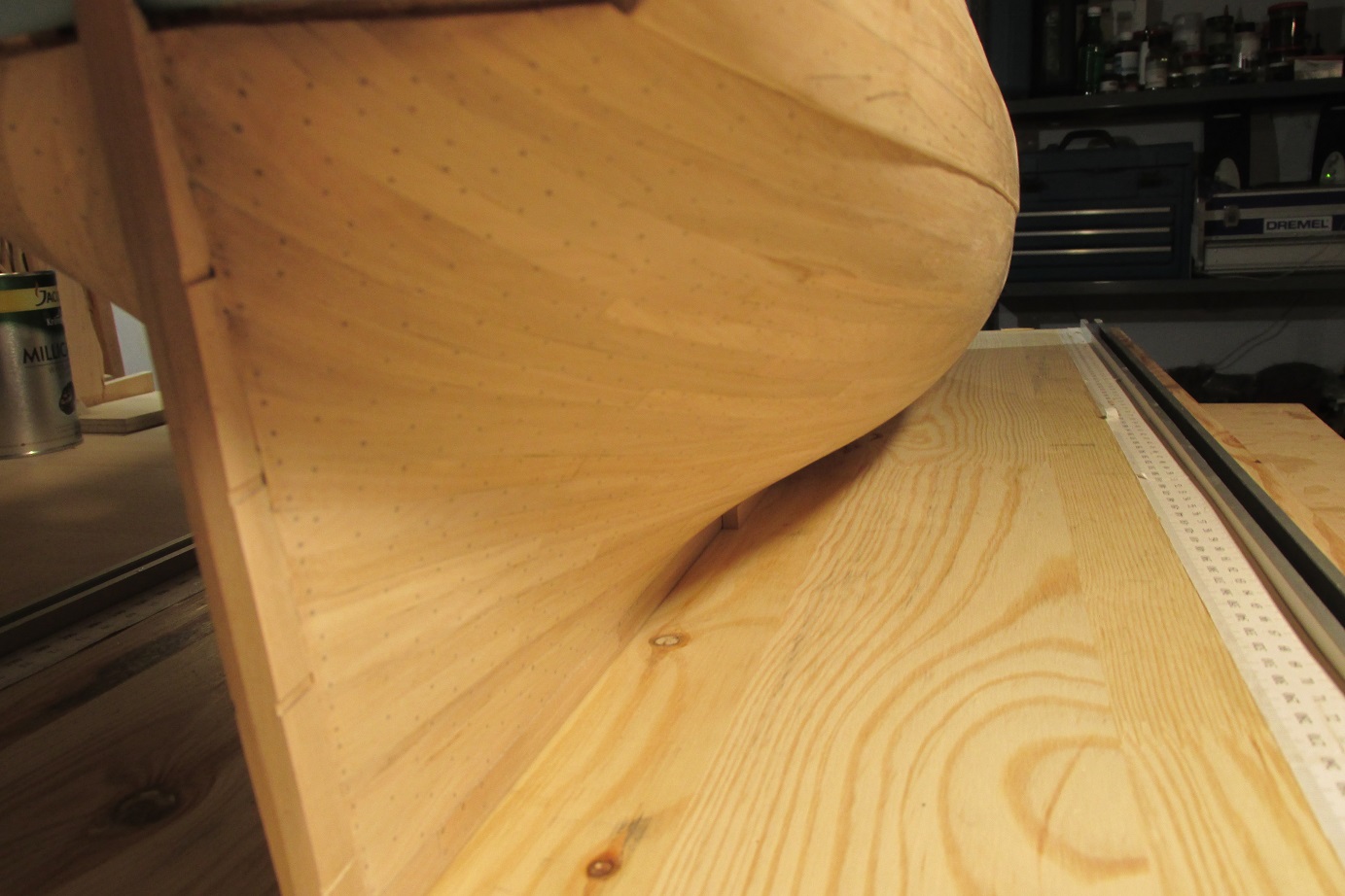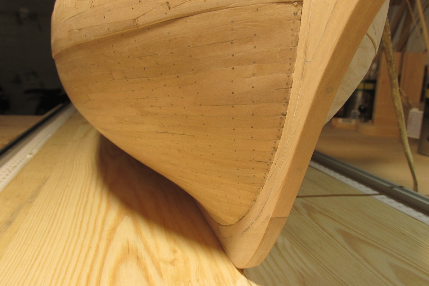 Kołkowanie zakończyłem, przynajmniej części dennej. Teraz szlifuję. W międzyczasie zrobiłem sobie znów przerwę w żmudnej pracy i wróciłem do płetwy sterowej.