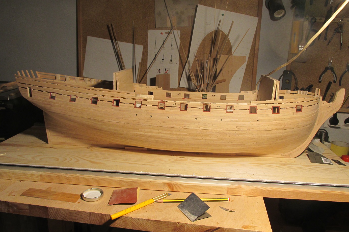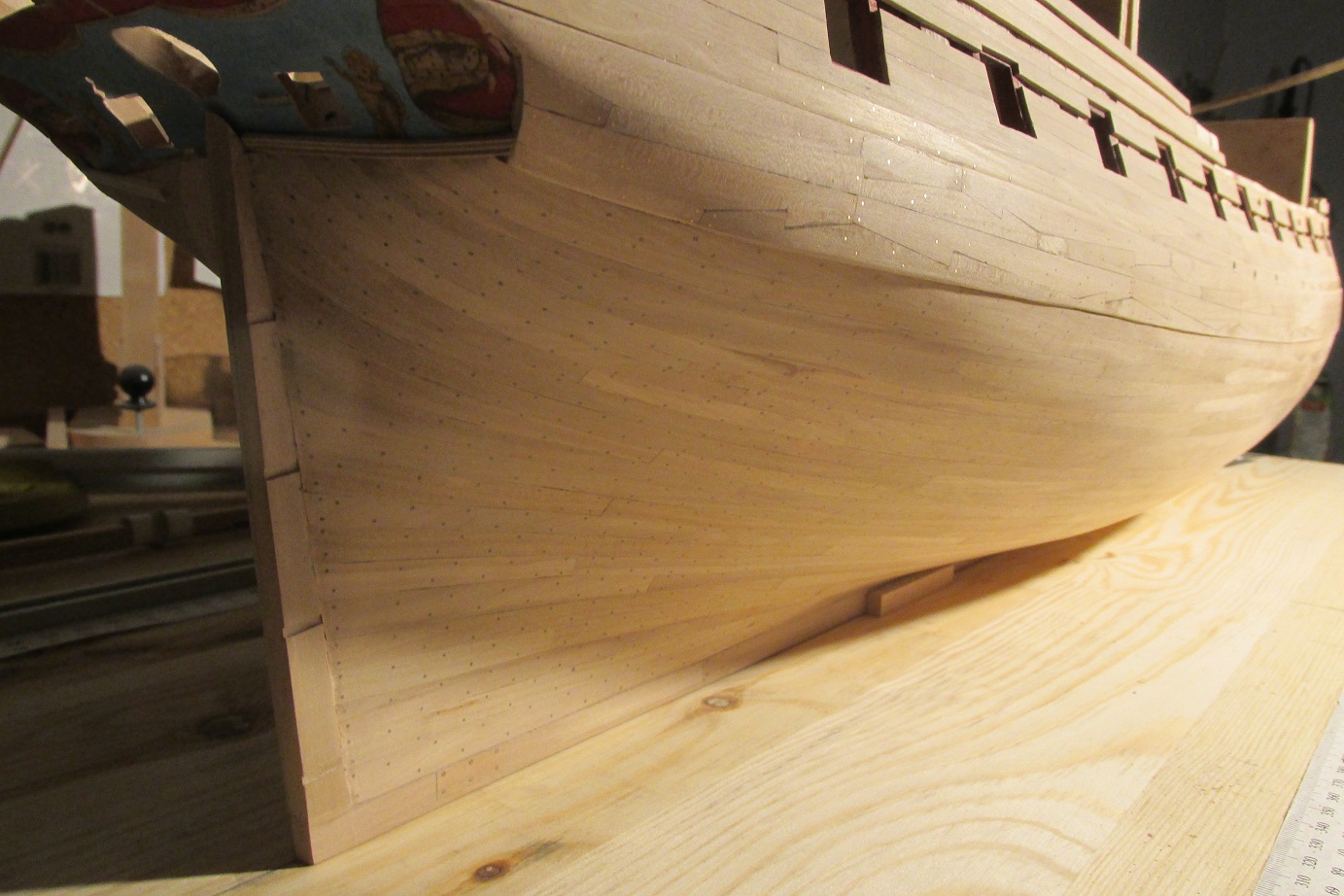 Wszystko powoli zmierza do malowania, jeszcze tylko kołkowanie burt w okolicach furt działowych oklejenie taśmą i malowanie. W części dennej wbiłem ponad 5000 kołków drewnianych, na odbojnicach kołki z drutu miedzianego fi 0,5 mm.