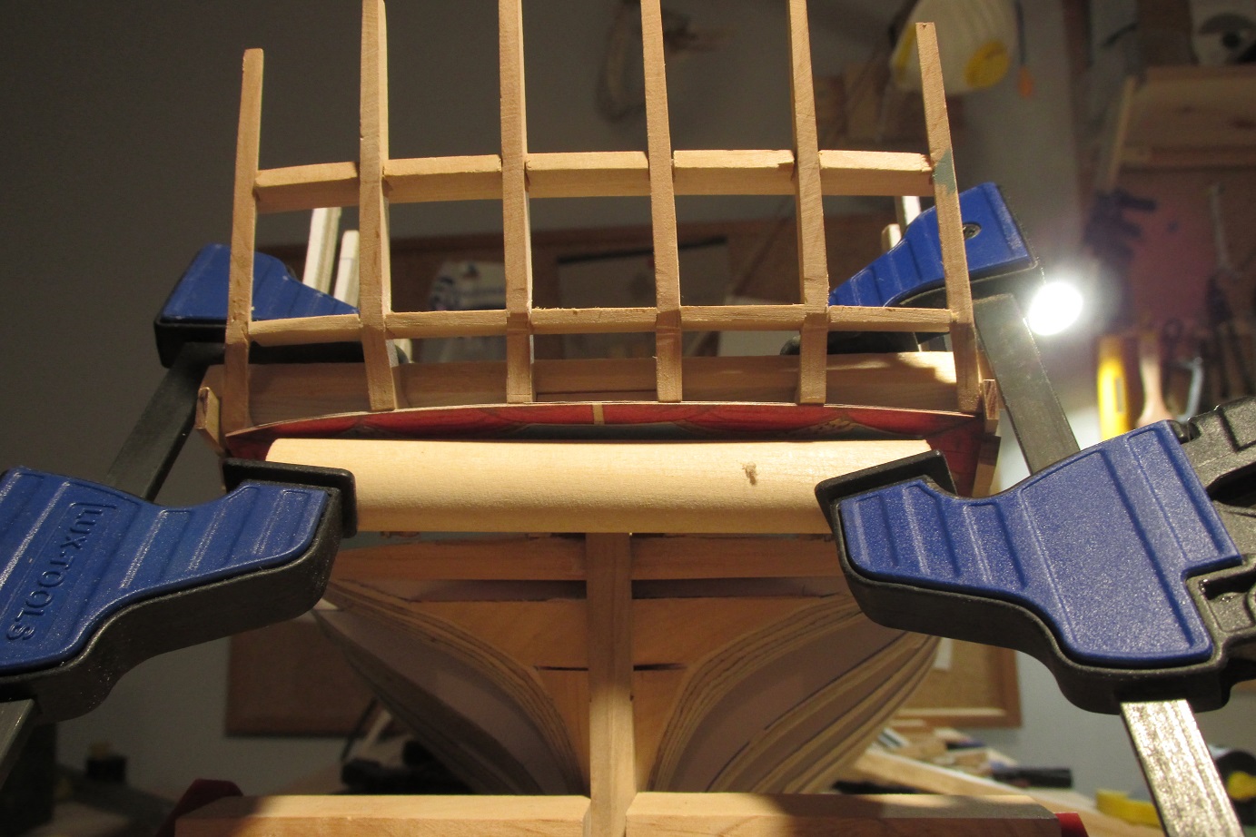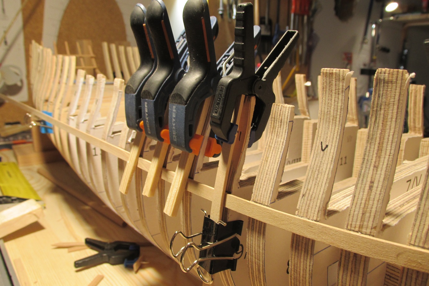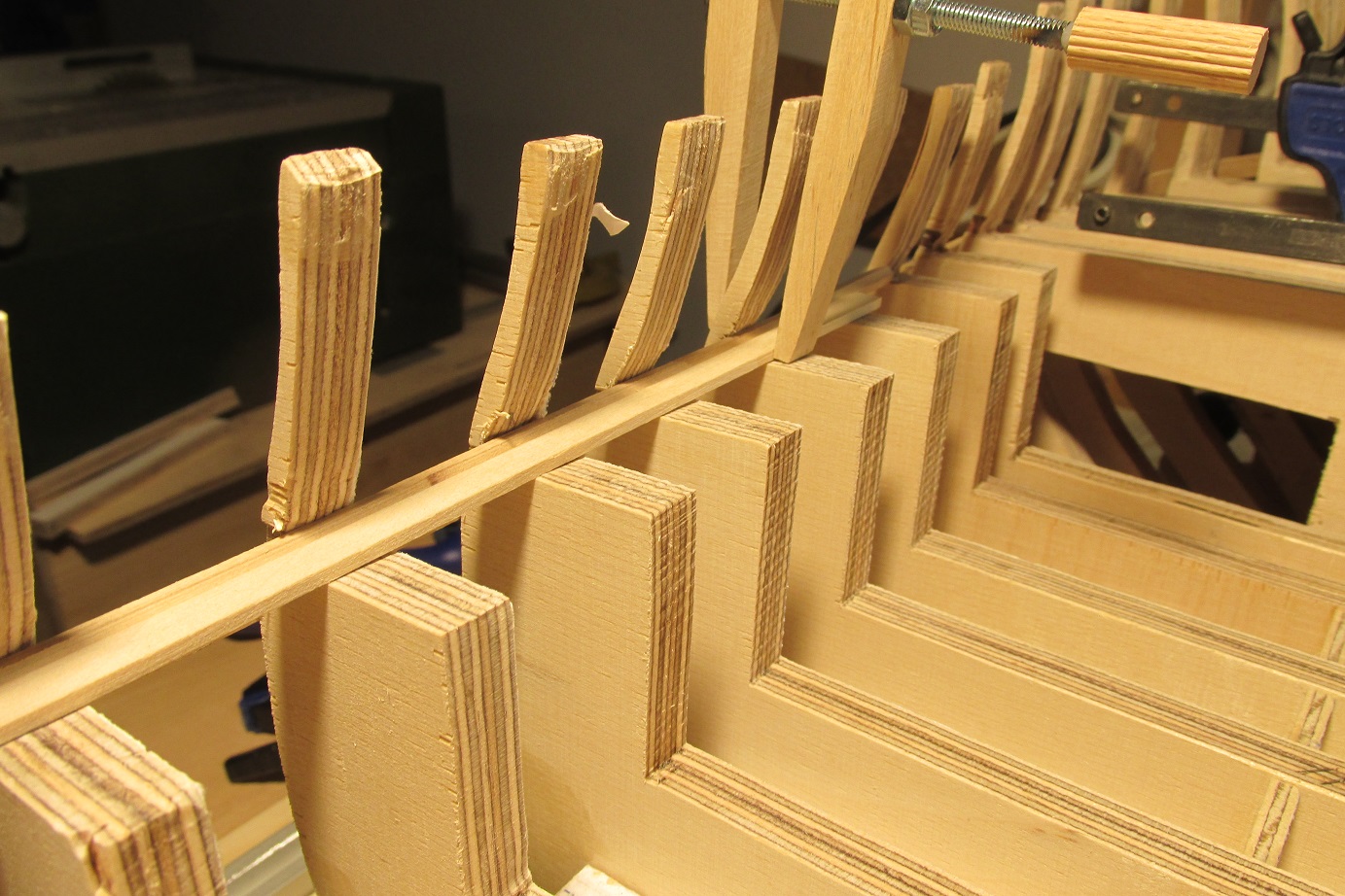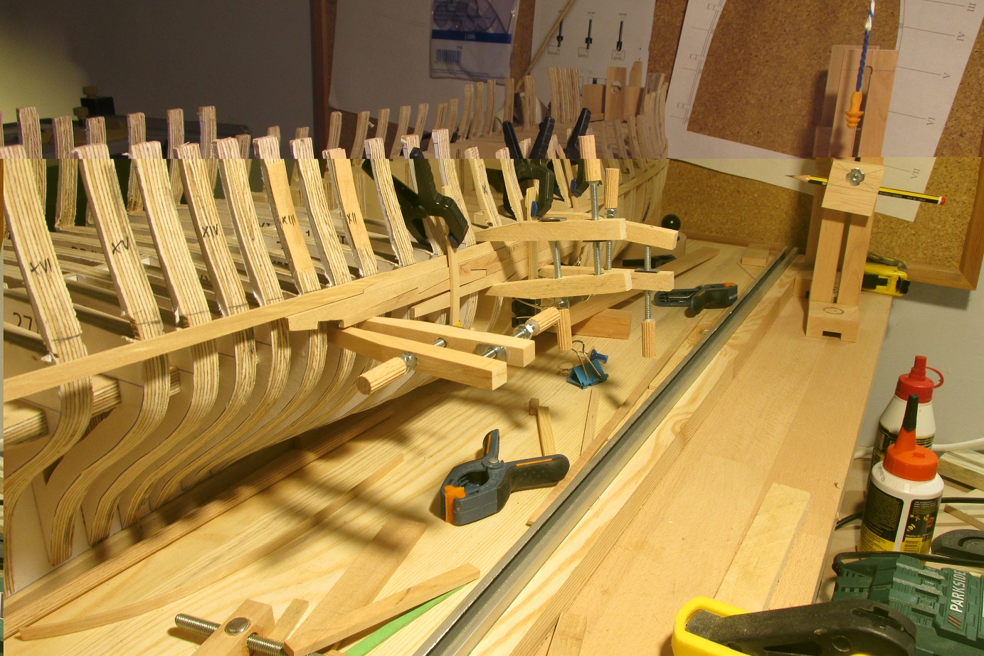 Cały czas walczę, pracy sporo a efektów na razie nie widać. Zabrałem się za klejenie pierwszej listwy poszycia nad pasem odbojowym. Zacząłem też pracę nad plankami zaciosowymi na pas odbojowy.
