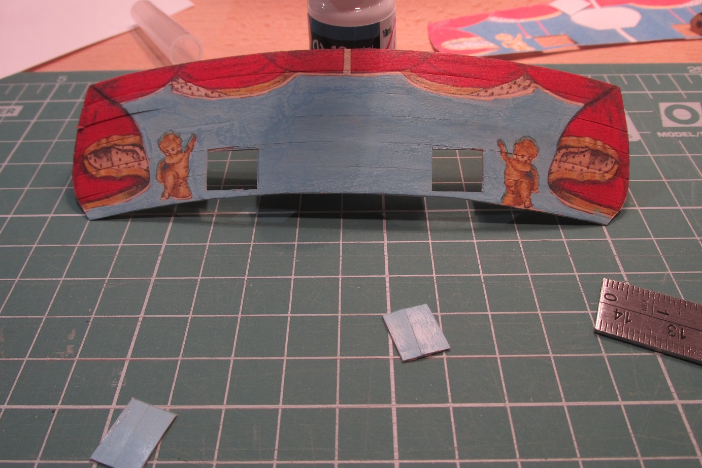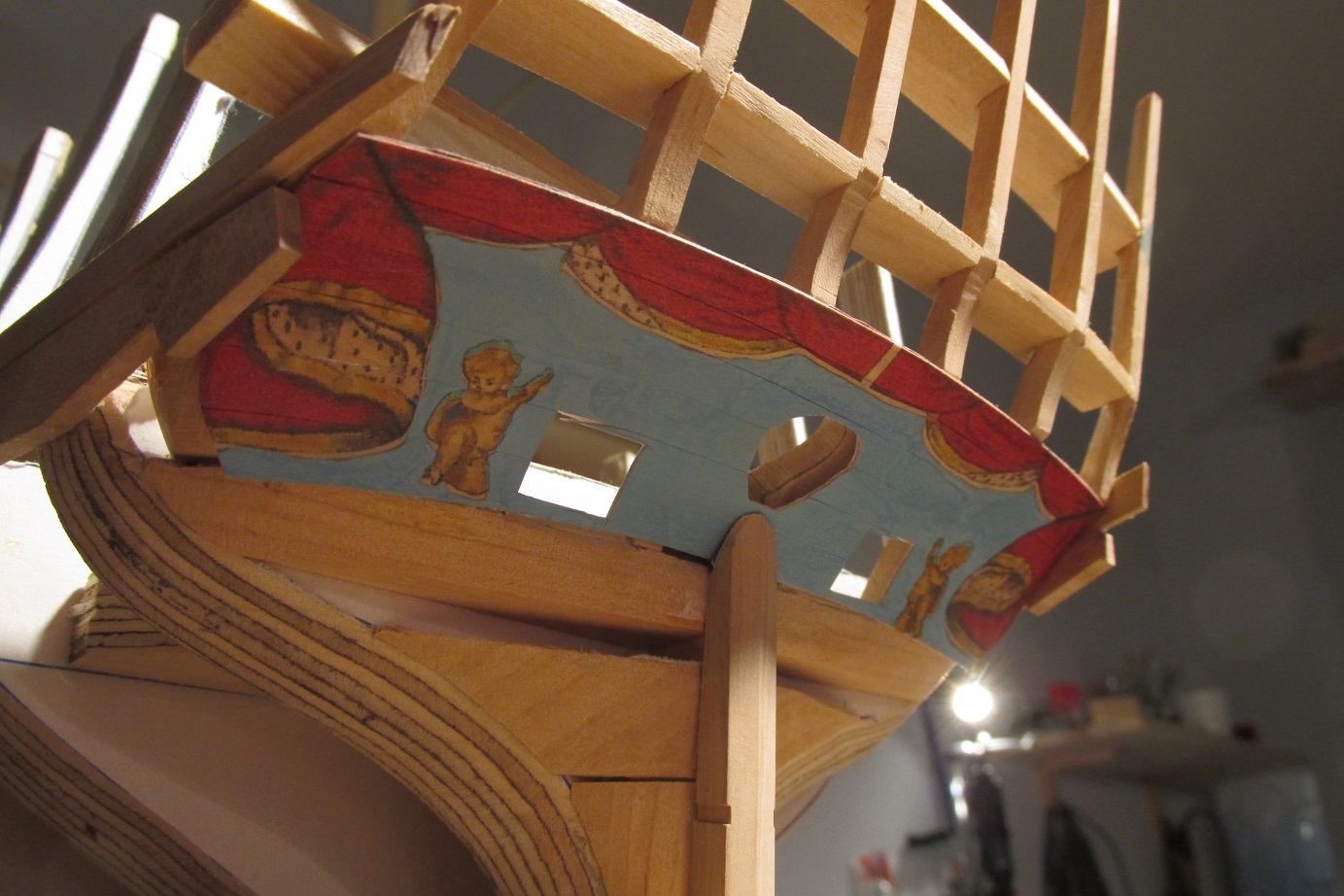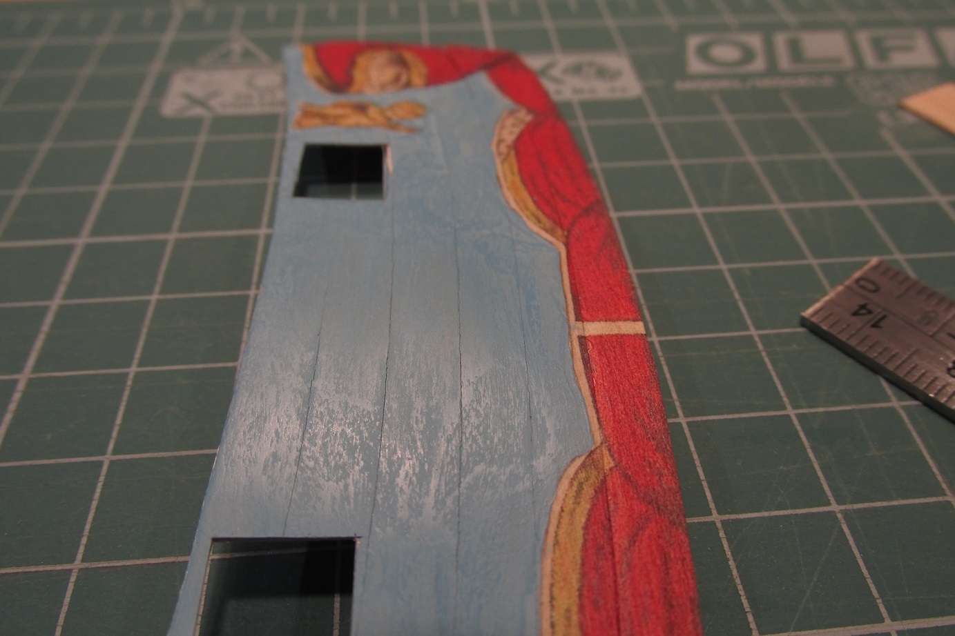 Cały czas montuję odbojnice. Ponieważ na rufie nachodzą one na tylne poszycie rufy, musiałem ten fragment poszyć. A ponieważ kolorowane fragmenty poszycia będę kolorował przed montażem, to musiałem wynaleźć niebieski kolor i wykonać malowidła rufowe.
