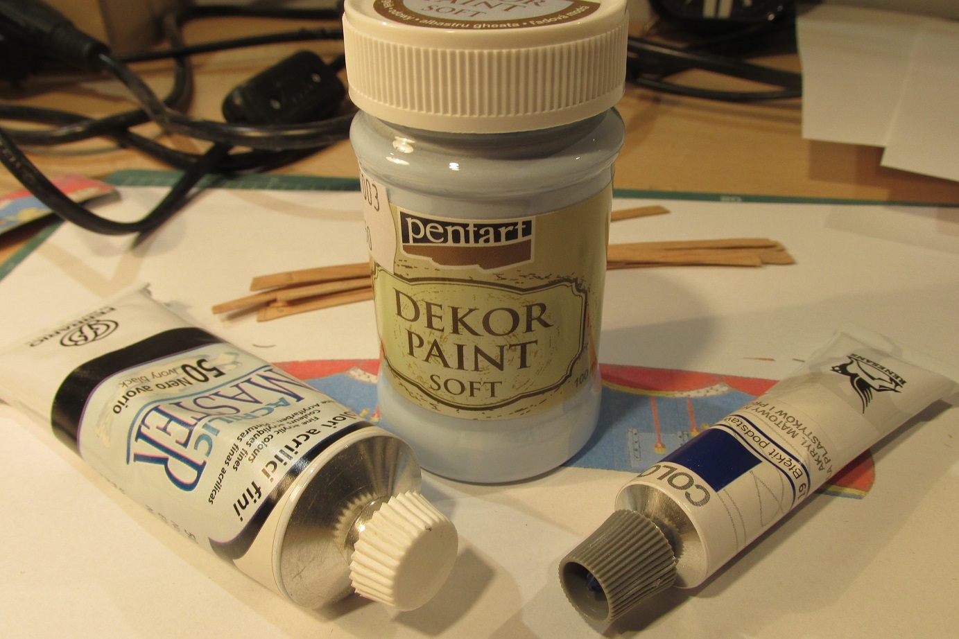 Z tych kolorów będę mieszał kolor. Jest tu bardzo jasny błękitny (farba kredowa), i akryle, jaskrawy ciemny niebieski oraz czarny.