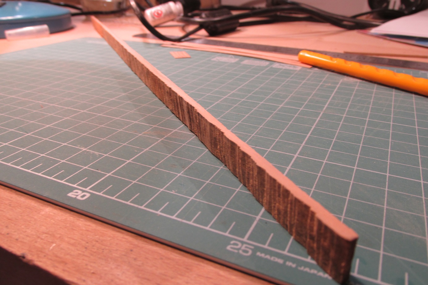 Po ścieraniu, zostało jakieś 0,5 mm. Po naklejeniu na kartkę papieru jeszcze pocieniłem ten fornir.