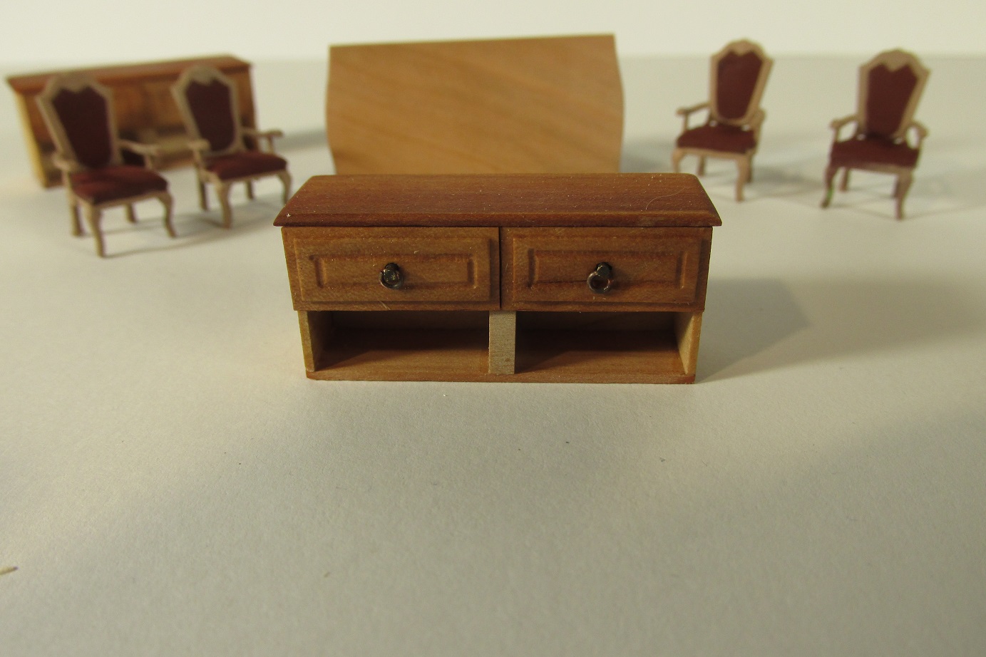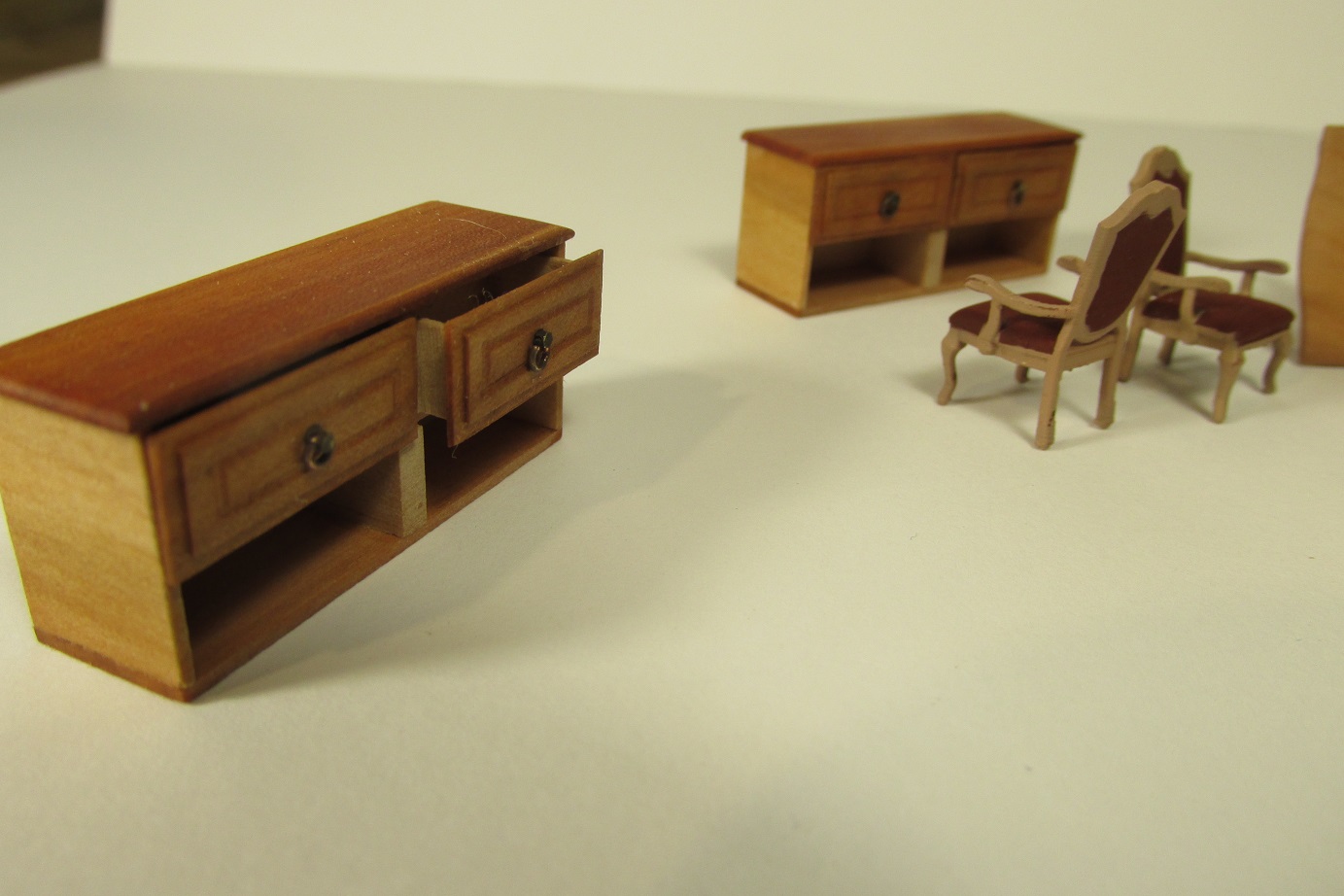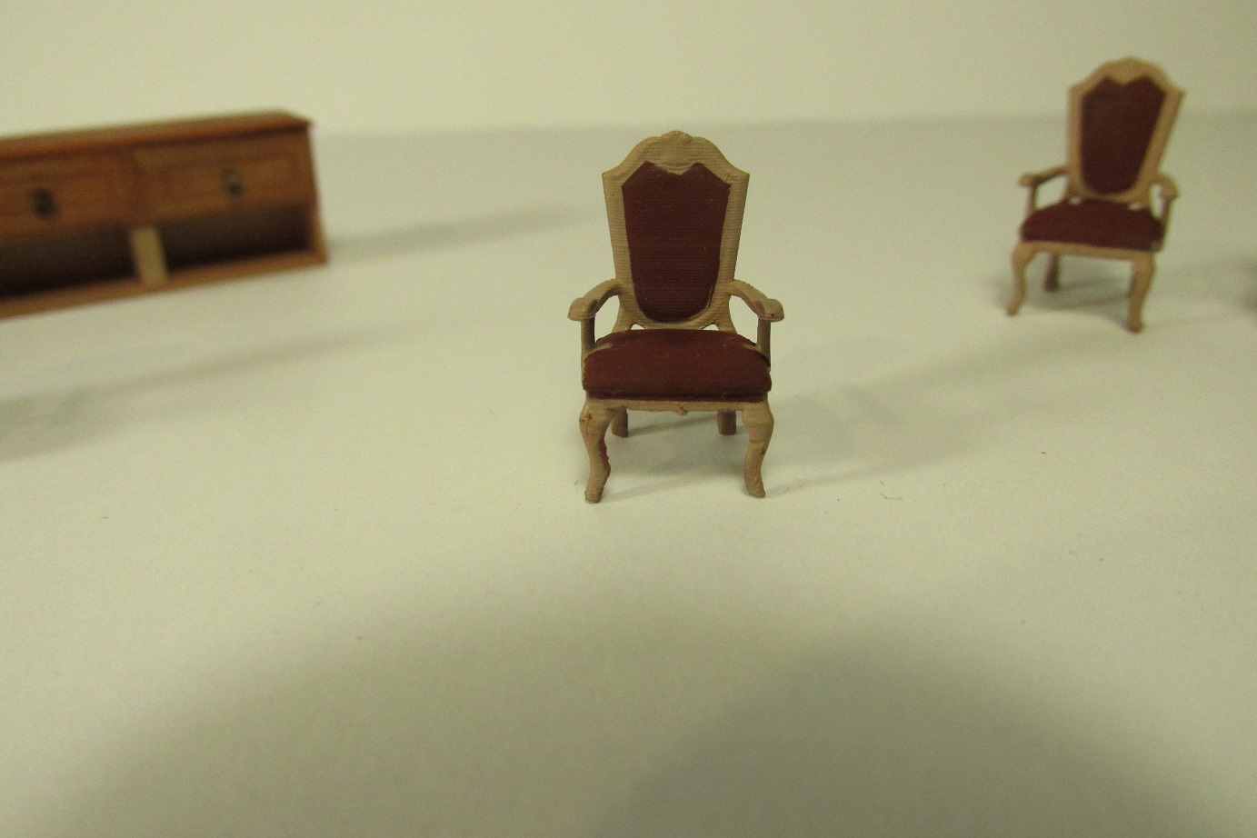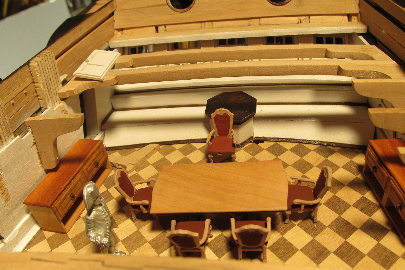 Budowa idzie dalej. Skończyłem montaż pokładników pod forecastle i zabrałem się przygotowanie montażu pokładników pod quarter deck. Najpierw muszę wyposażyć kapitański pokój. Dziś malowałem fotele, wczoraj wykonałem meble.