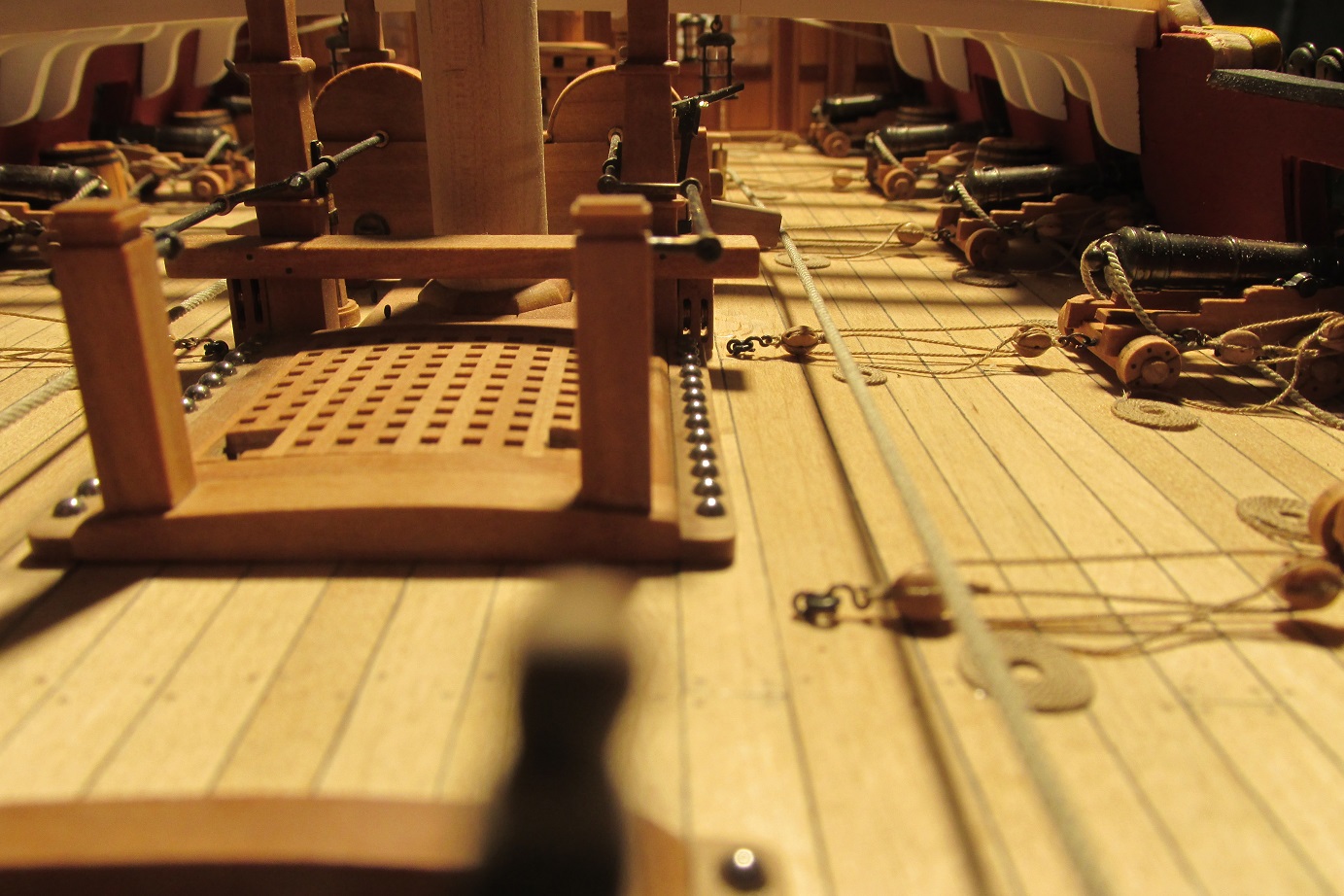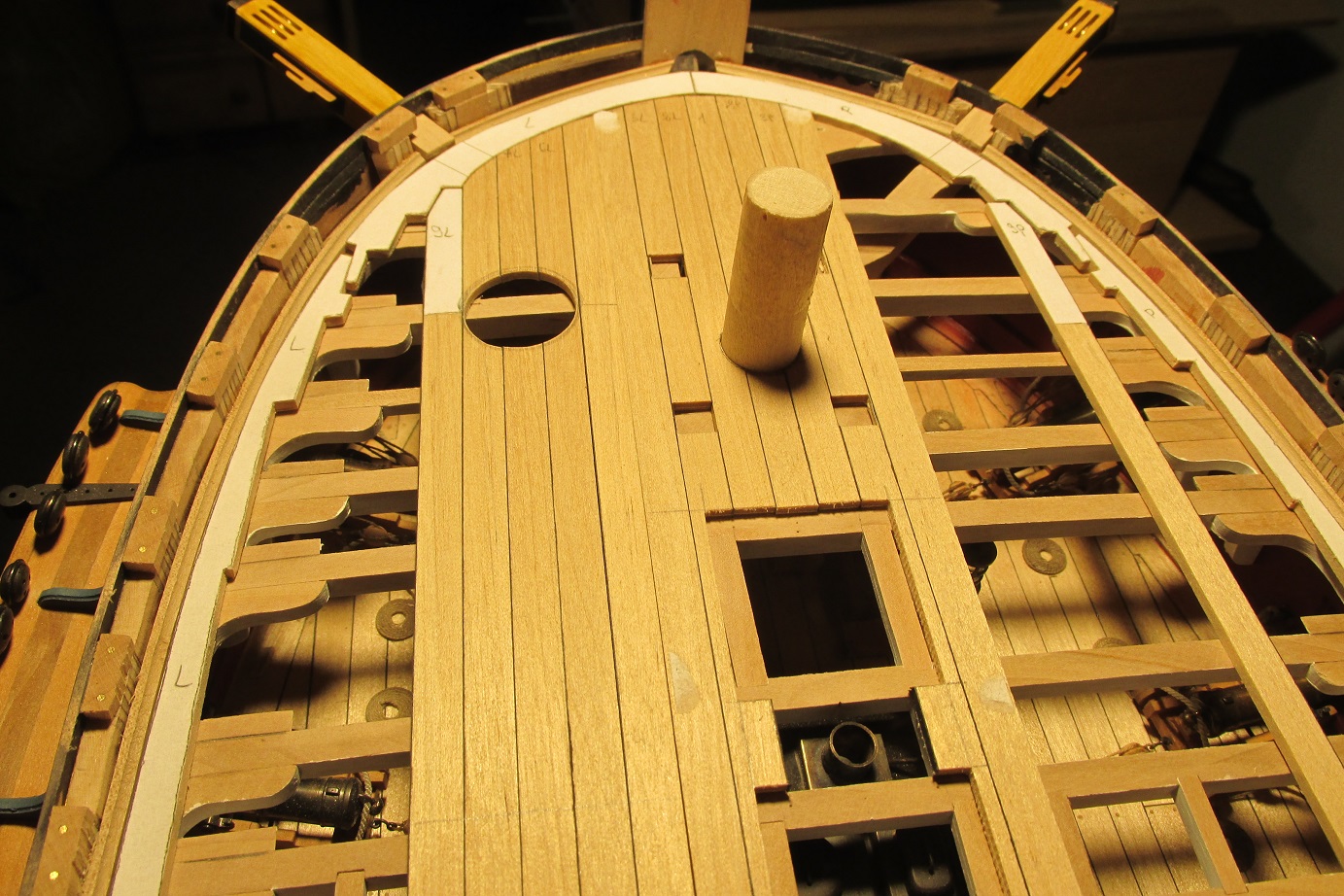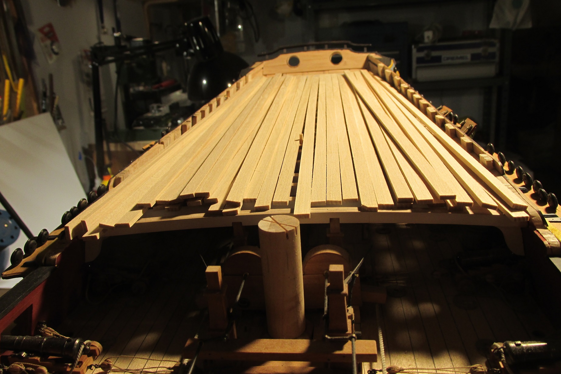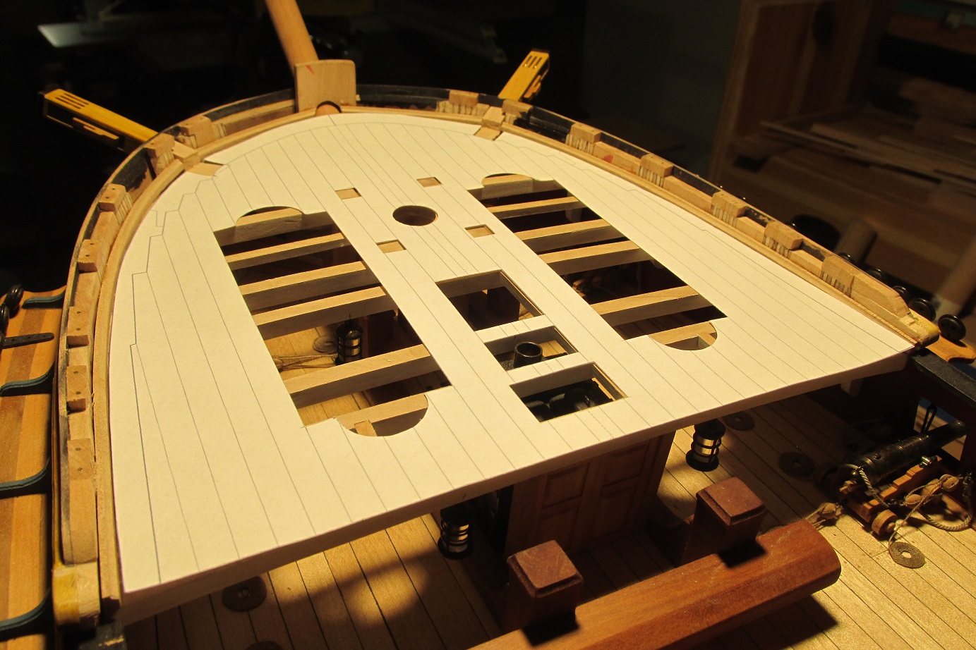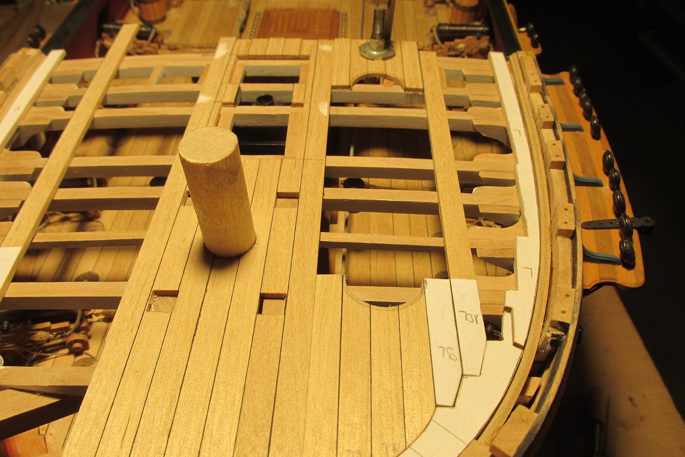 Rozpocząłem przyjemniejszy etap deskowania pokładu forecastle. Pomalowałem i wkleiłem pokładniki pod quarterdeck.