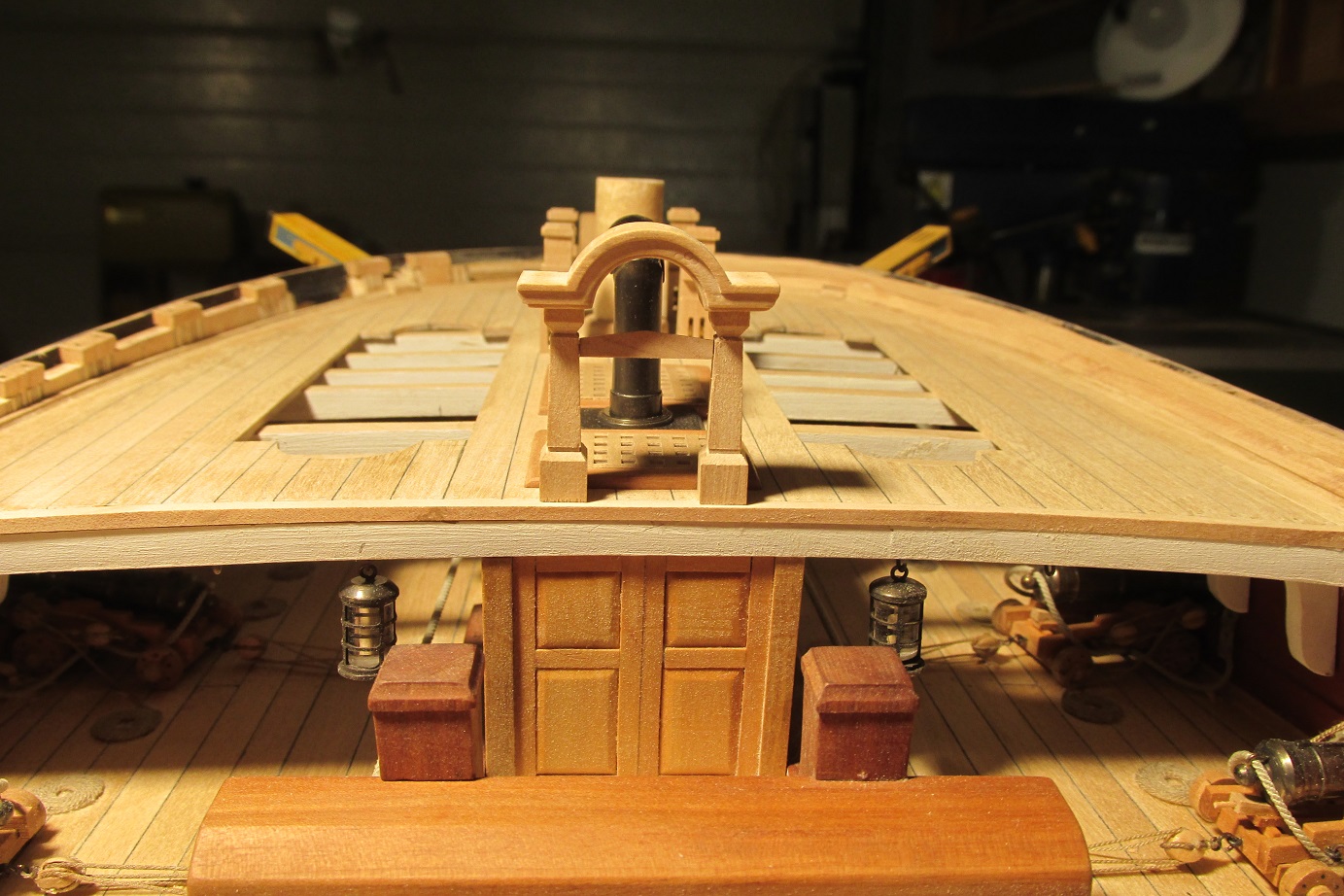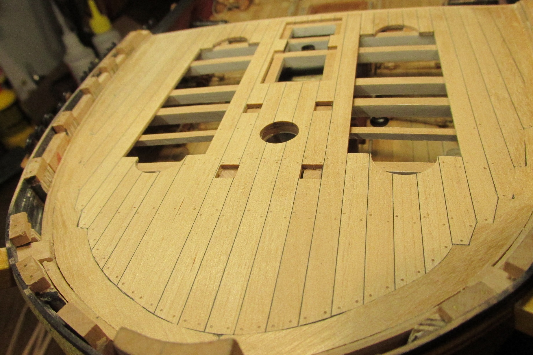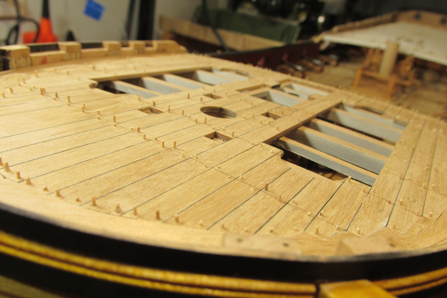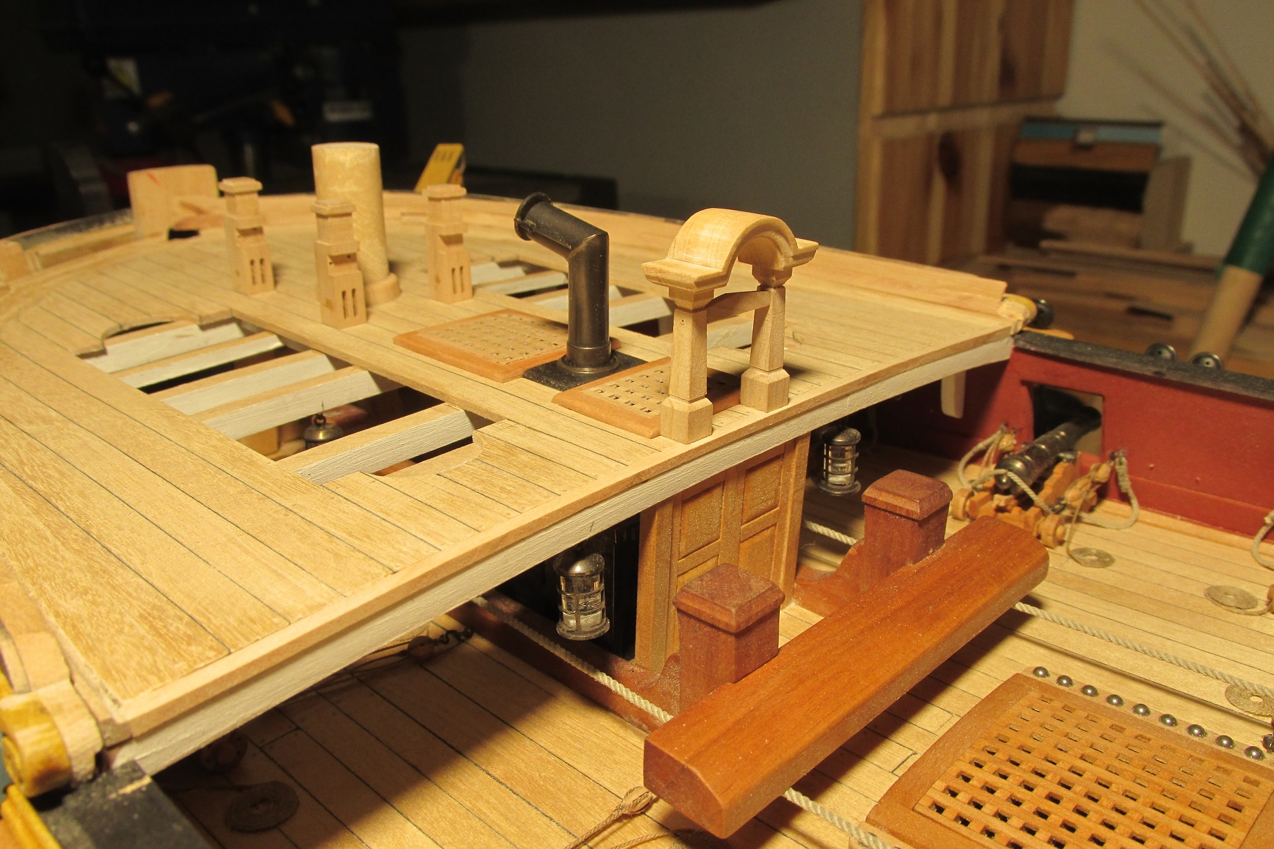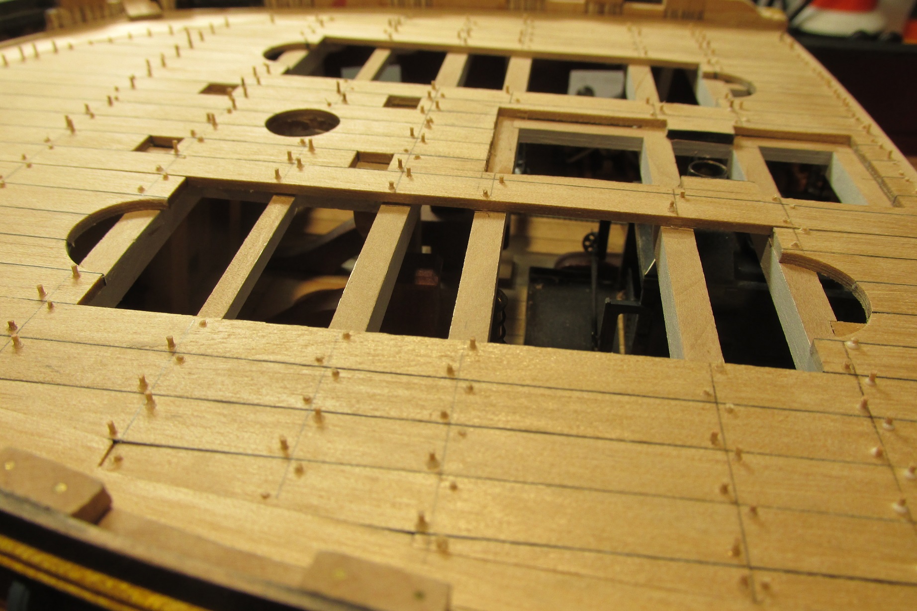 Rozpocząłem przyjemniejszy etap deskowania pokładu forecastle. Pomalowałem i wkleiłem pokładniki pod quarterdeck.
