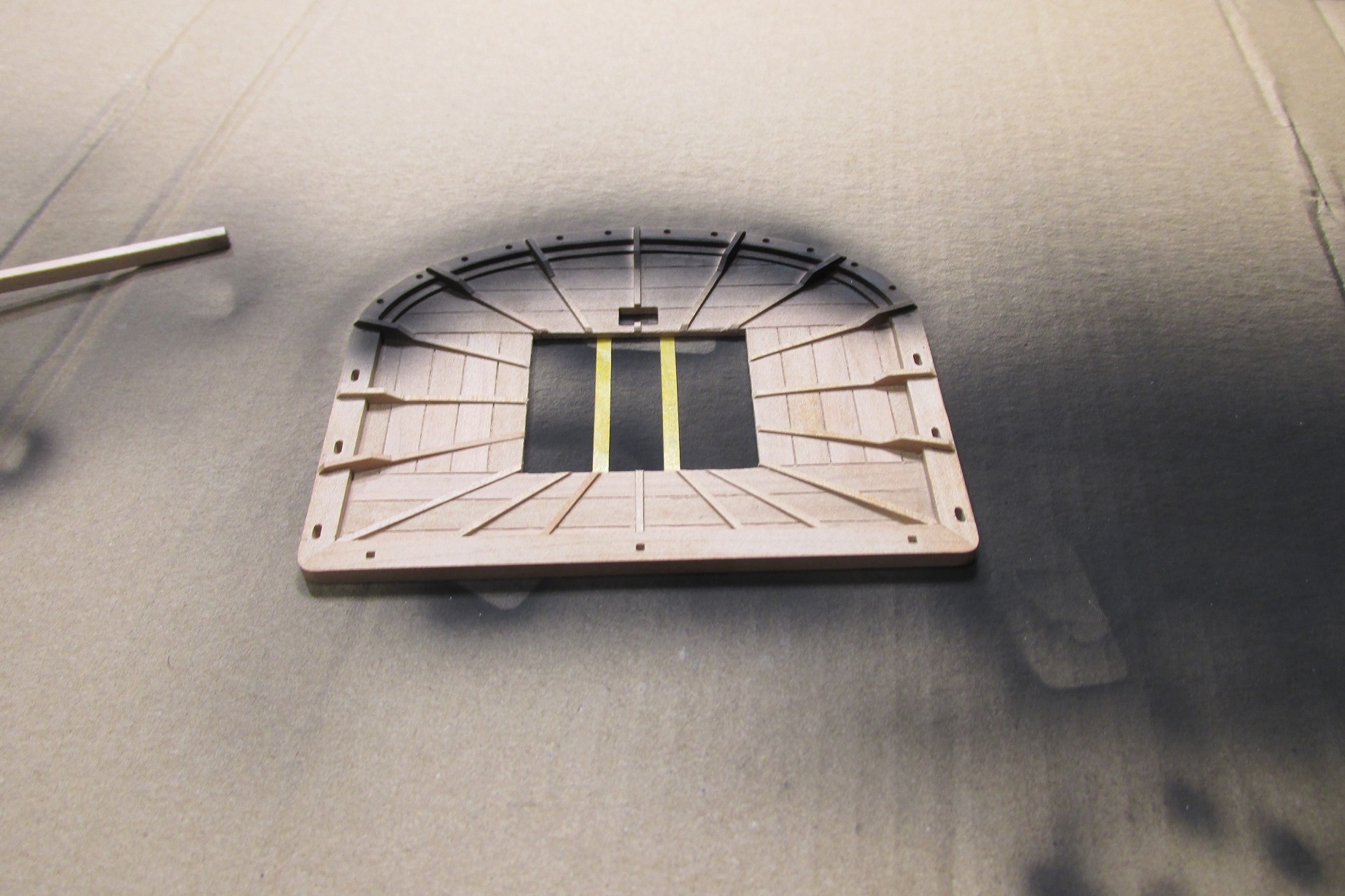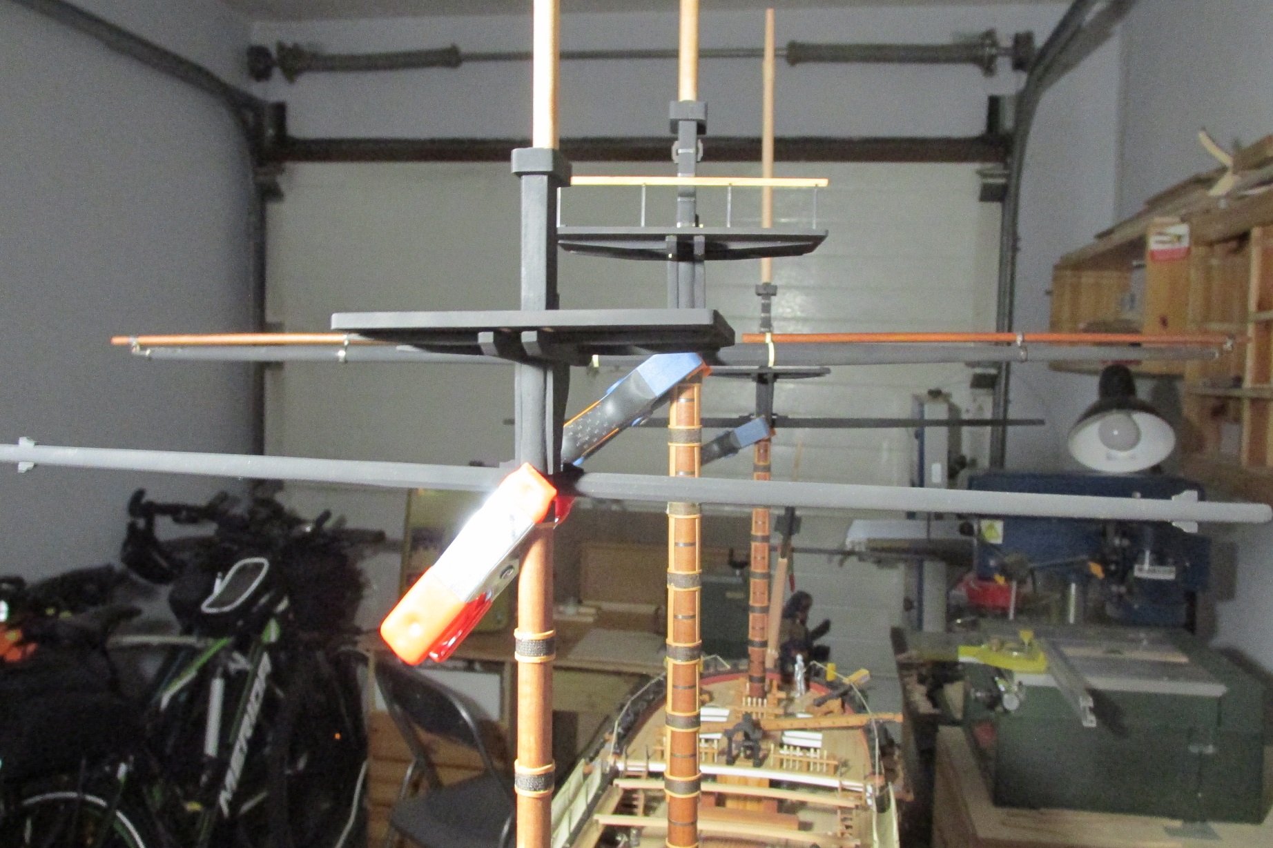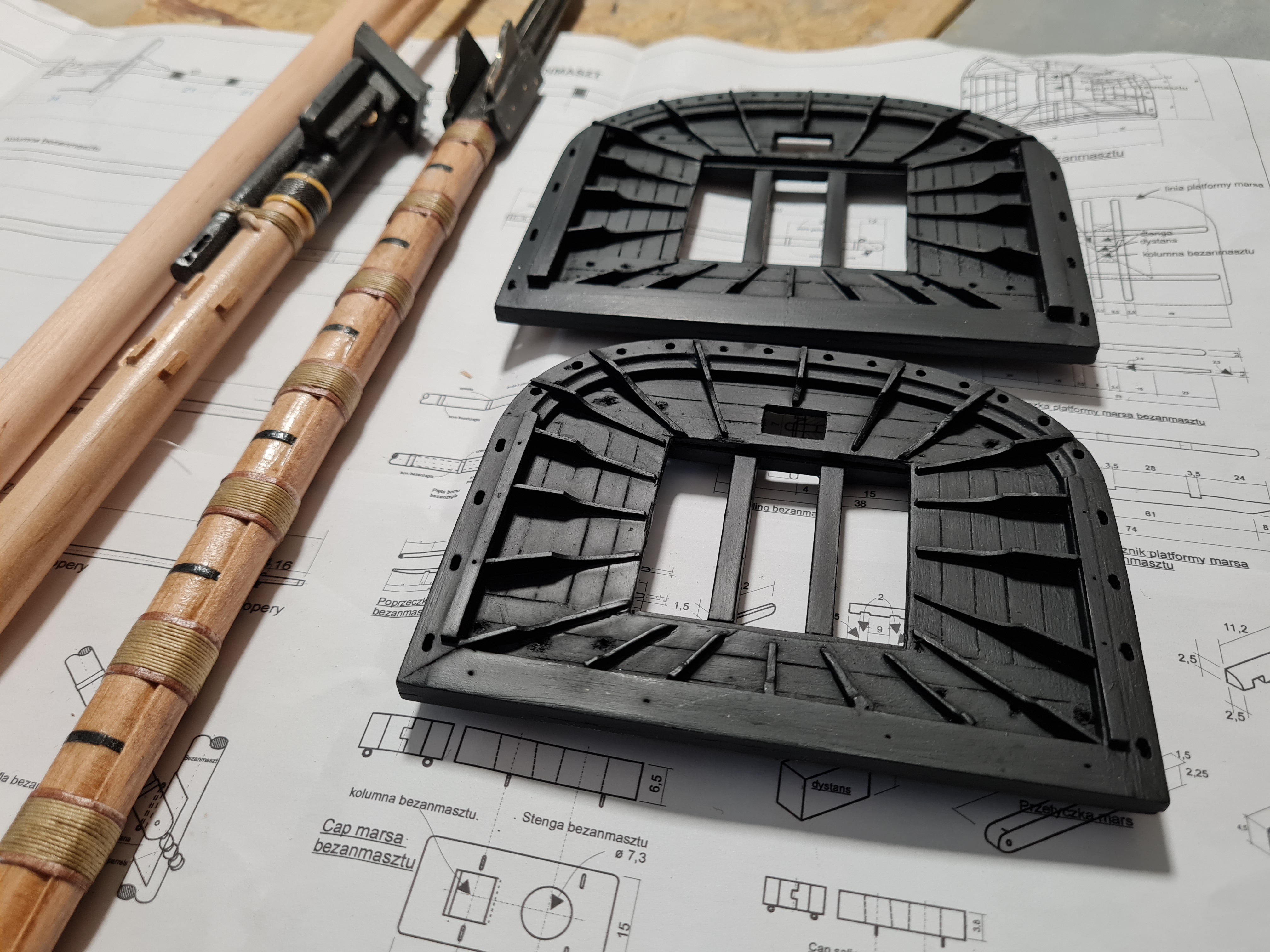 Cały czas jestem przy masztach i wykonuję elementy, których nie wykonałem wcześniej jak na przykład podporę pod drzewce masztów wytykowych złożonych wzdłuż burty. Dziś malowałem reje i bocianie gniazdo kolumny bezana.