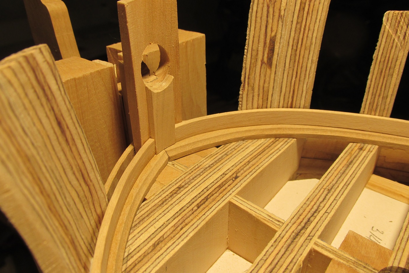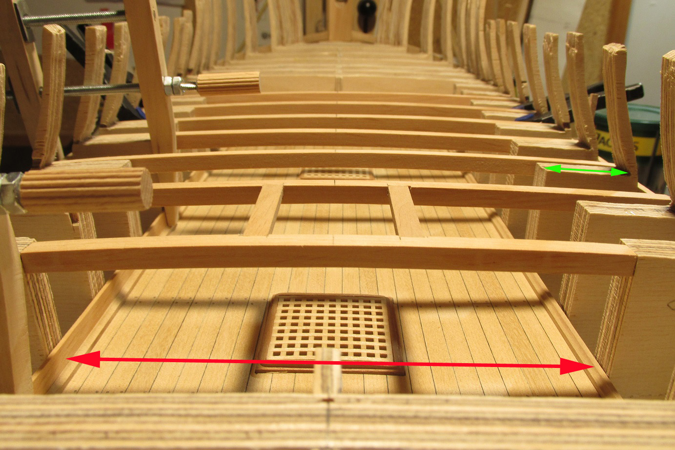 Wydaje mi się, że się kropnąłeś z tym dolnym pokładem. Nie mam tych planów więc nie mogę tego zweryfikować, ale 'na oko' myślę, że ten pokład jest za wąski - czerwona strzałka, położony tam między zbyt masywnymi wręgami (zmodyfikowanymi grodziami) - zielona strzałka. Górny pokład wygląda OK.