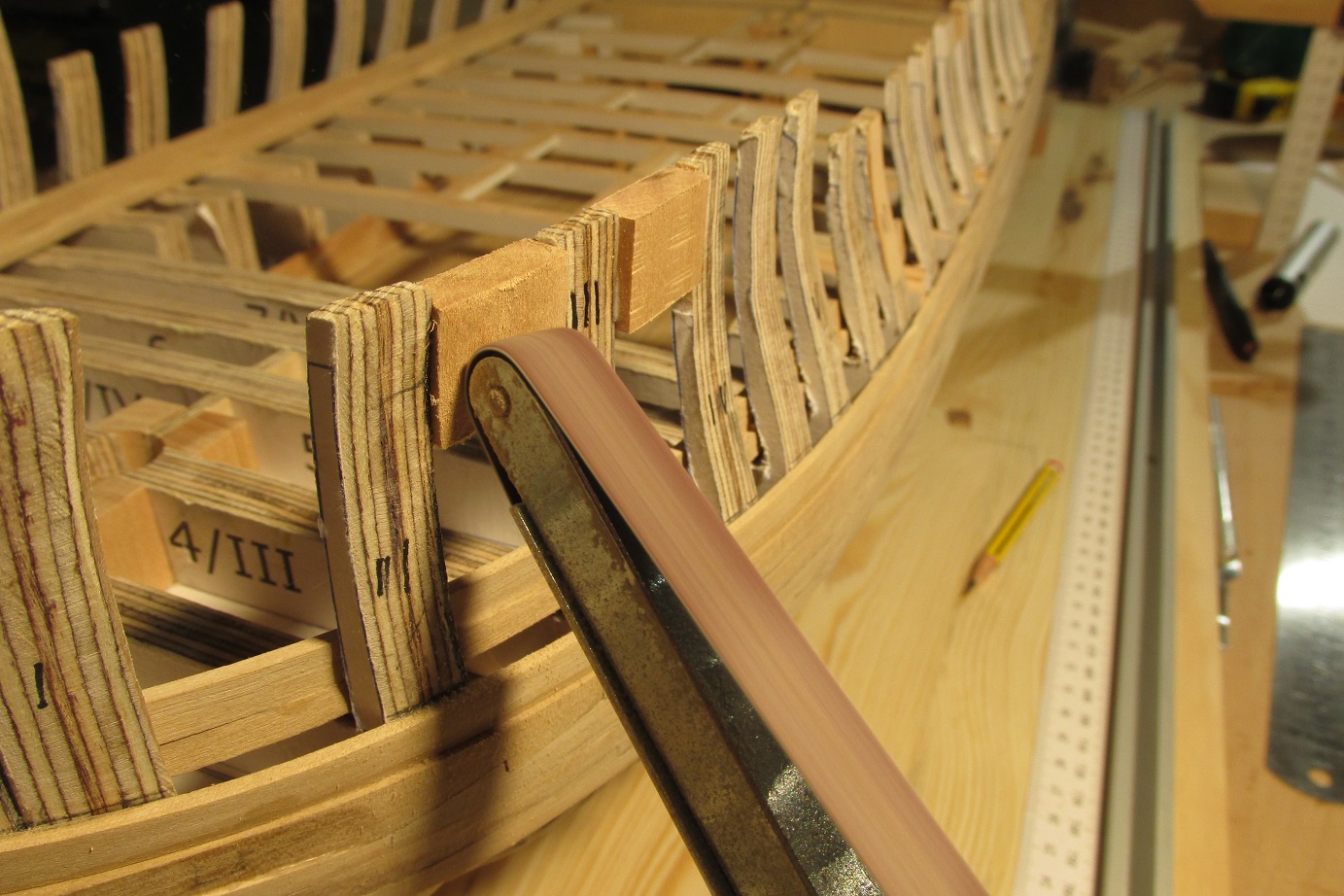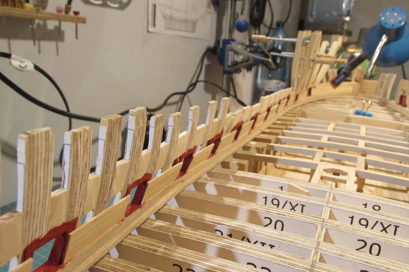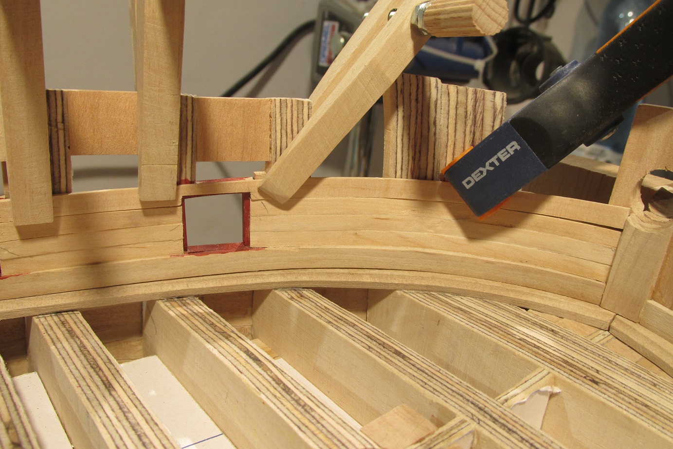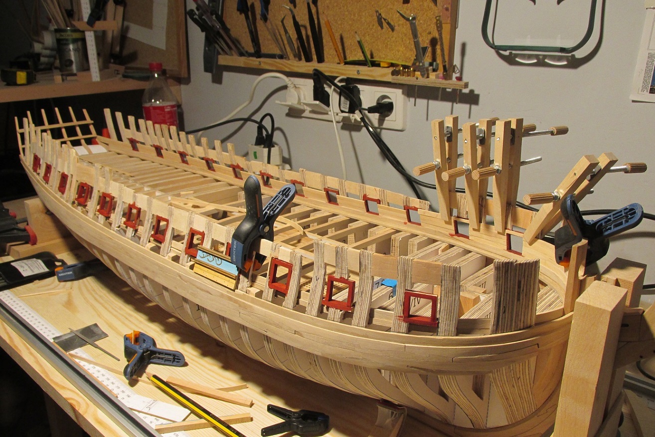 Mnie również udało się podczas weekendu coś polepić. Robię wewnętrzne poszycie nadburcia z listewek olchowych 4,5x1,2. Pomalowałem też furty mieszaniną czerwonego tuszu, akrylu i bejcy mahoniowej. Po szlifowaniu powinno wglądać dobrze. No i zacząłem próbować wygląd poszycia zewnętrznego