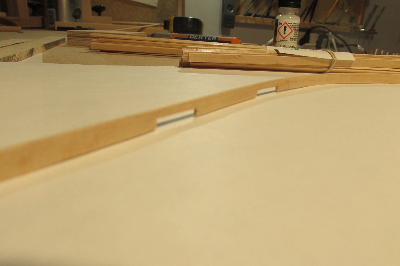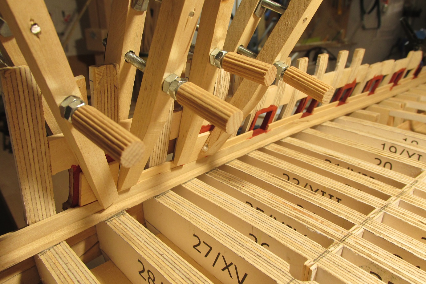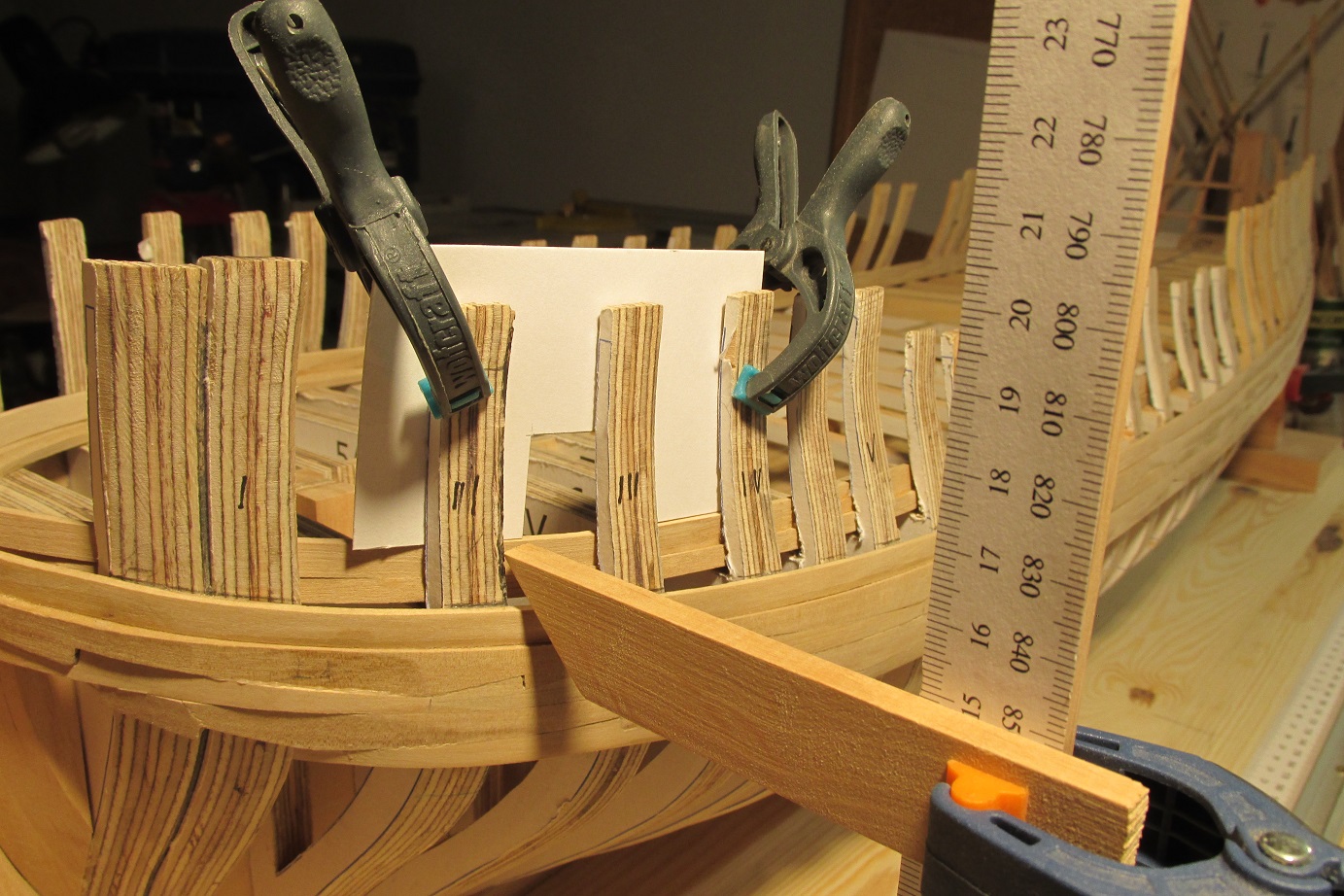 Mnie również udało się podczas weekendu coś polepić. Robię wewnętrzne poszycie nadburcia z listewek olchowych 4,5x1,2. Pomalowałem też furty mieszaniną czerwonego tuszu, akrylu i bejcy mahoniowej. Po szlifowaniu powinno wglądać dobrze. No i zacząłem próbować wygląd poszycia zewnętrznego