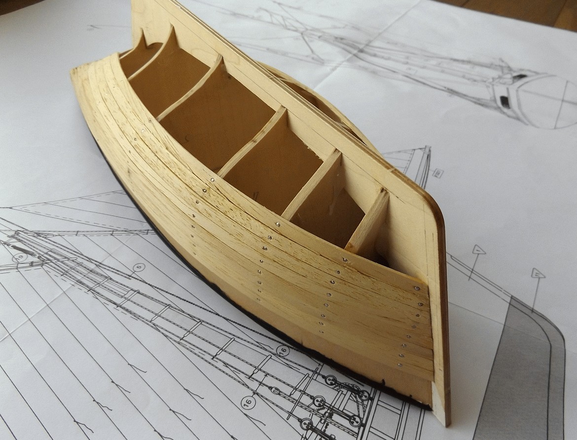 Rozpocząłem też poszywanie kadłuba. To moje pierwsze w pełni drewniane prace, ale jestem zadowolony, Po szpachlowaniu i szlifowaniu powinno być tak, że mucha nie siądzie.